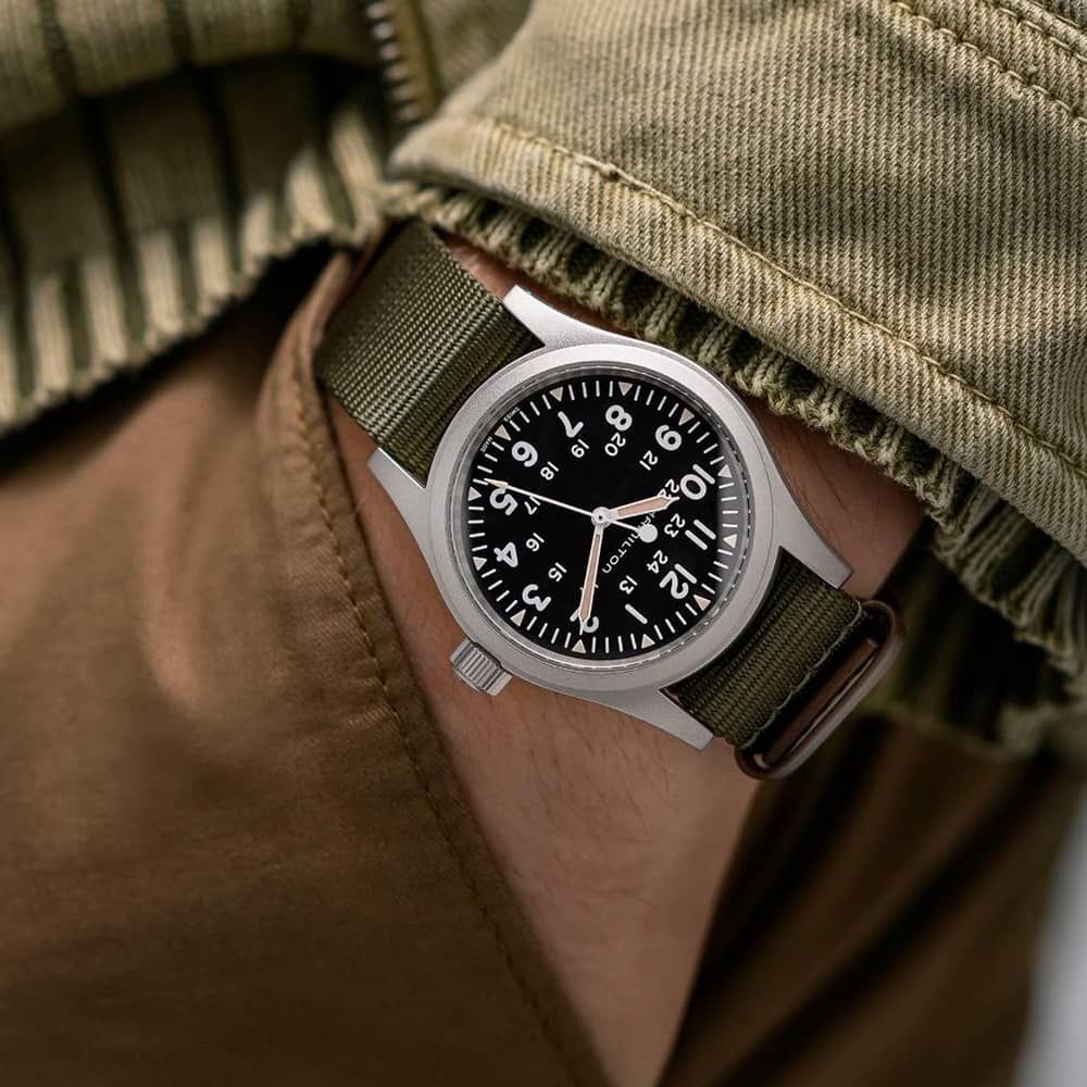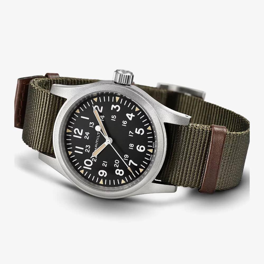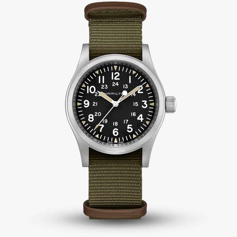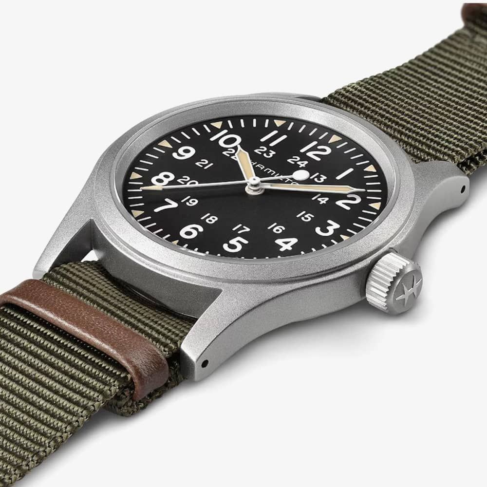 Featuring a matte stainless steel case, three-hand display, and dark dial with light, luminescent numerals and indexes indicating hours and minutes, the new Khaki Field Mechanical is a faithful recreation of its original 1960s predecessor. Complete with a durable NATO strap, this watch remains true to Hamilton's military heritage. Inspired by military design and built to last, this is the original soldier's watch. As seen in Sonic the Hedgehog (2020), worn by Tom Wachowski, played by James Marsden.