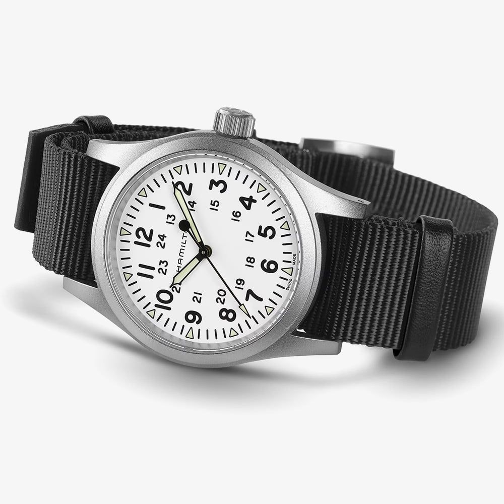 Compact yet powerful, the Khaki Field Mechanical is the perfect companion for outdoor adventures. Encased in a 38 mm stainless steel case, its matte white dial features bold black indexes with a Super-LumiNova® coating for enhanced readability. Paired with a rugged NATO strap, this watch faithfully recreates its 1960s predecessor, staying true to Hamilton’s proud military heritage.