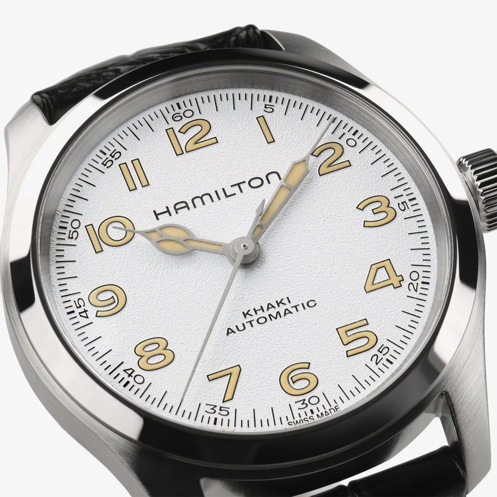 A timeless favourite from the world of film, the original Murph watch has been given a modern update. With its white dial and subtly domed numerals for better readability, the Khaki Field Murph retains its vintage appeal through elegant cathedral hands. Ideal for both Hamilton fans and movie buffs, the classic 38mm design now comes with a sleek, black leather strap for a sophisticated look.