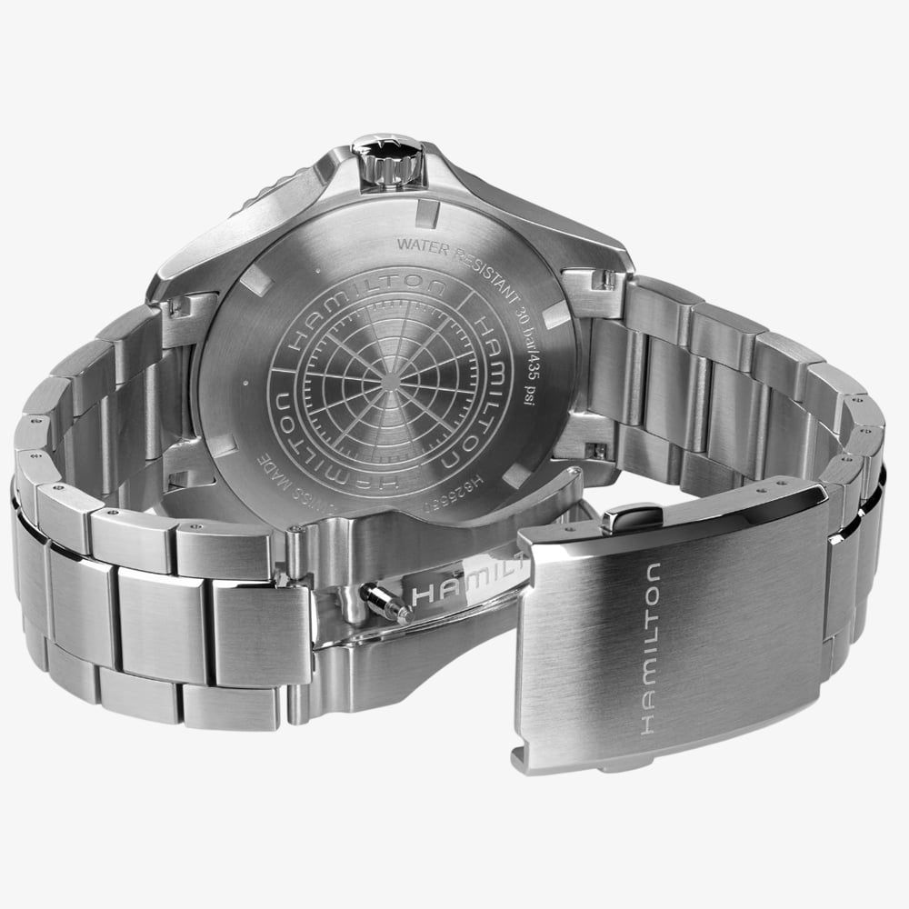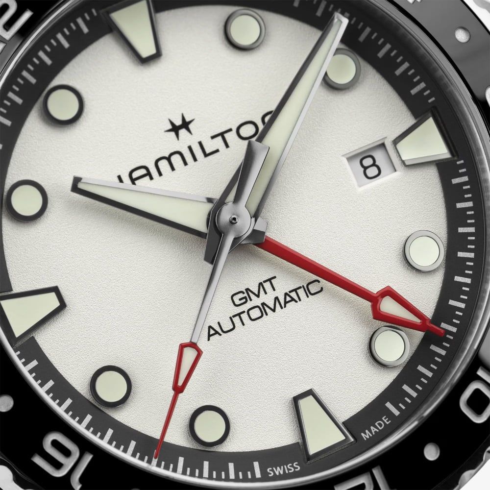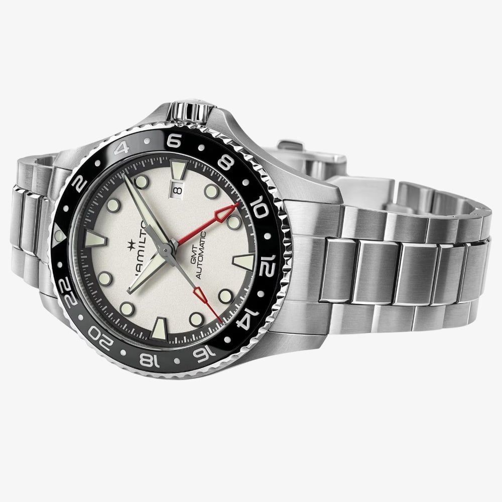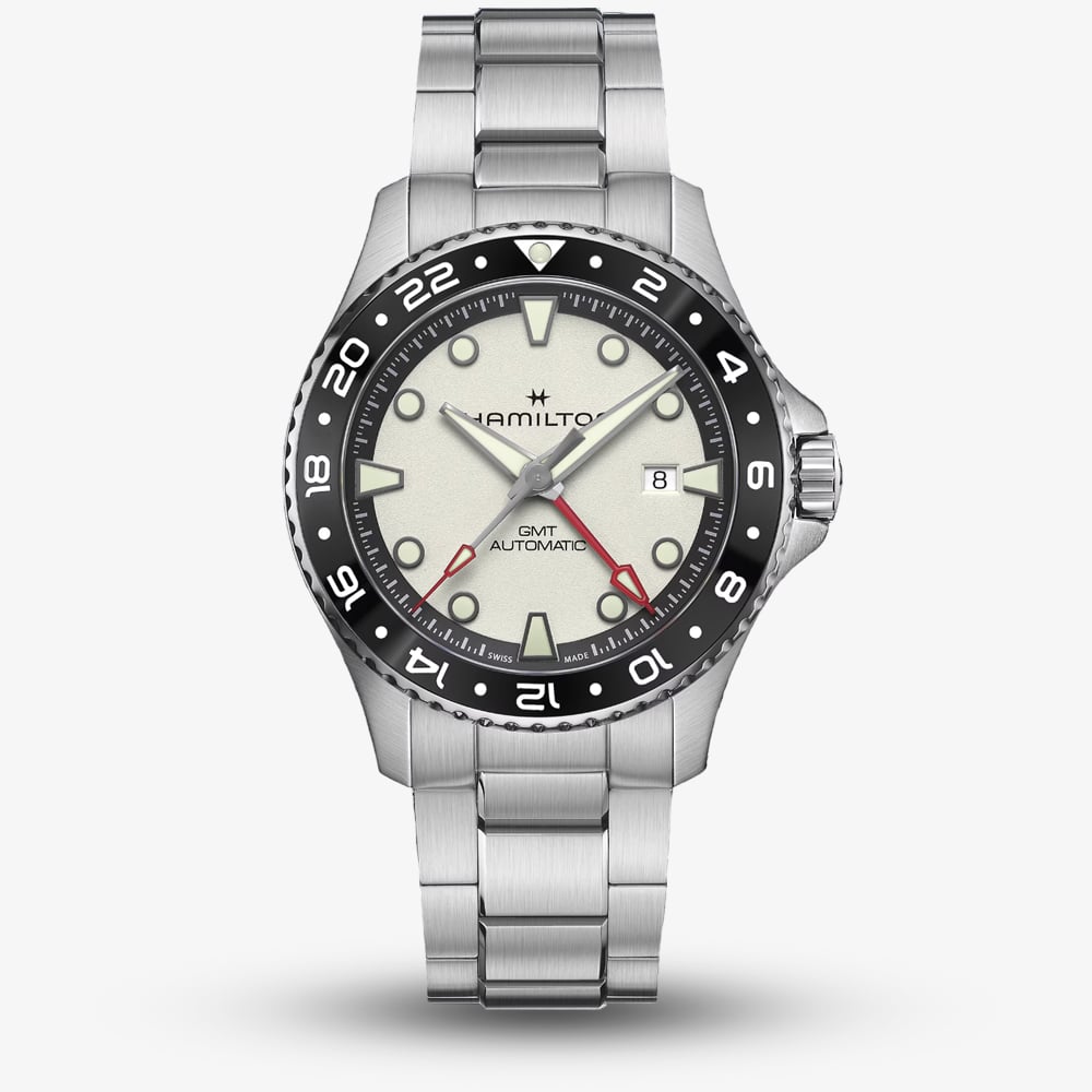 The Hamilton watch H82555150 combines a round shaped stainless steel case and silver stainless steel bracelet with fold over clasp. The silver case is composed of a black ceramic uni-directional bezel with a screwed in case back and a lug width of 22mm. The white analogue dial has dot & baton hour markers, as well as luminescent hands, and a date display which is protected beneath scratch resistant sapphire crystal glass. Power is generated by the automatic movement with 25 jewels and a power reserve of up to 80 hours. a gmt function. This model also weighs 217.0 grams and has a water resistance of up to 300 metres.