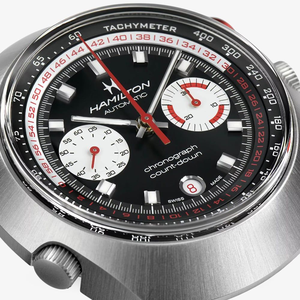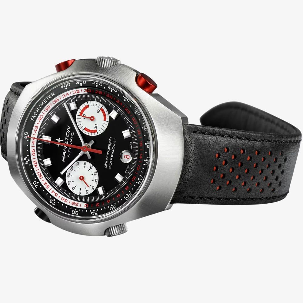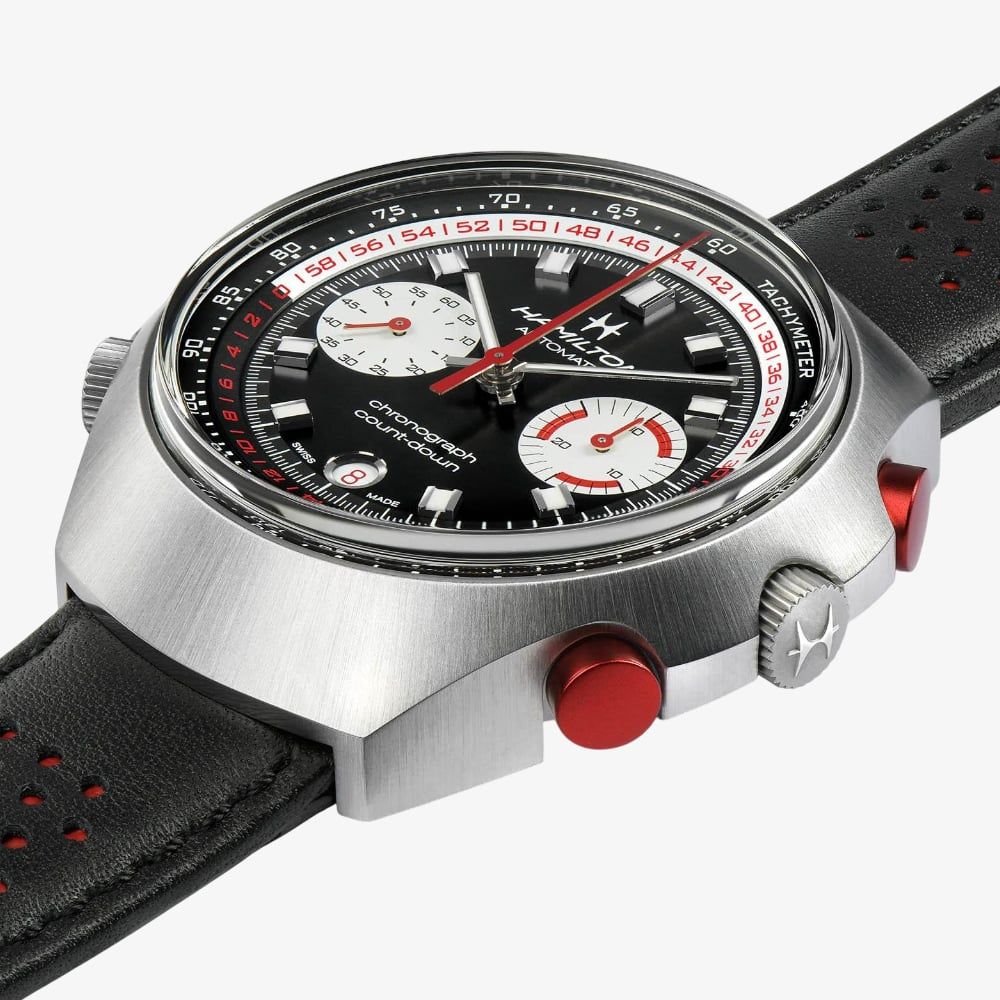 This limited edition timepiece draws inspiration from the vintage Chrono-Matic E of the early 1970s. This watch features a distinctive-shaped stainless steel case. The bold black dial exudes a vintage charm, while bold red accents on the chronograph pushers, hands, and inner dial ring add a dynamic flair. The sapphire crystal glass with double anti-reflective coating ensures clarity and durability.