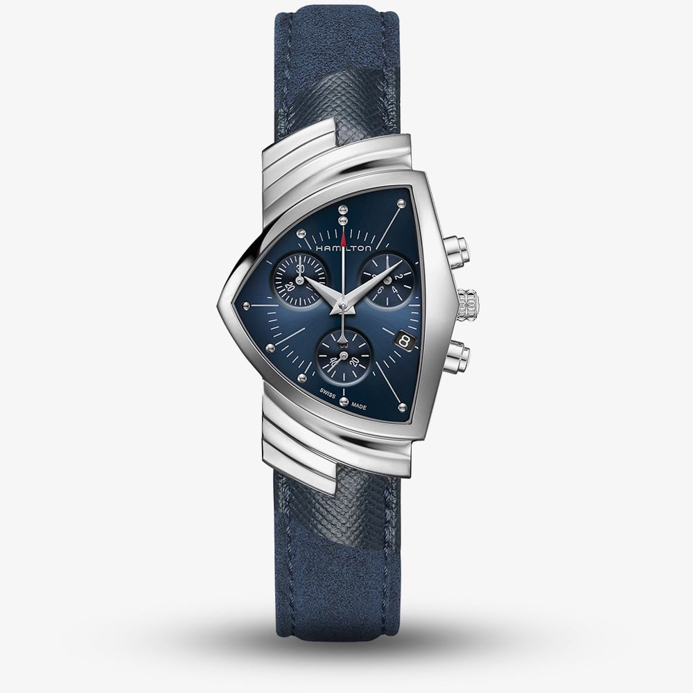 Turn heads with the watch that started a revolution. The Hamilton Ventura Chronograph Quartz combines cutting-edge performance with unmistakable style, inspired by Elvis Presley’s Blue Suede Shoes. Featuring a sleek stainless-steel case, vibrant gradient blue dial, and soft Alcantara strap, this standout timepiece is powered by a high-precision 23-jewel quartz movement and packed with chronograph functionality.