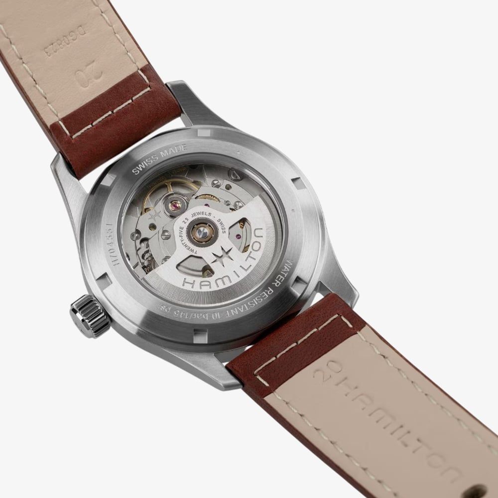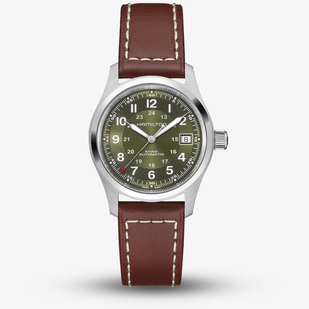 With a design rooted in military tradition, this watch delivers rugged durability. The vibrant green dial brings a fresh, confident look to a classic field watch. Luminous hands and numerals provide crystal-clear visibility in any light. Powered by an automatic movement, it stays accurate with your natural motion—no winding or batteries required. Its compact stainless steel case is built to endure your busiest days while maintaining a comfortable, lightweight feel. The genuine brown leather strap adds warmth and texture, pairing effortlessly with casual outfits or business attire.