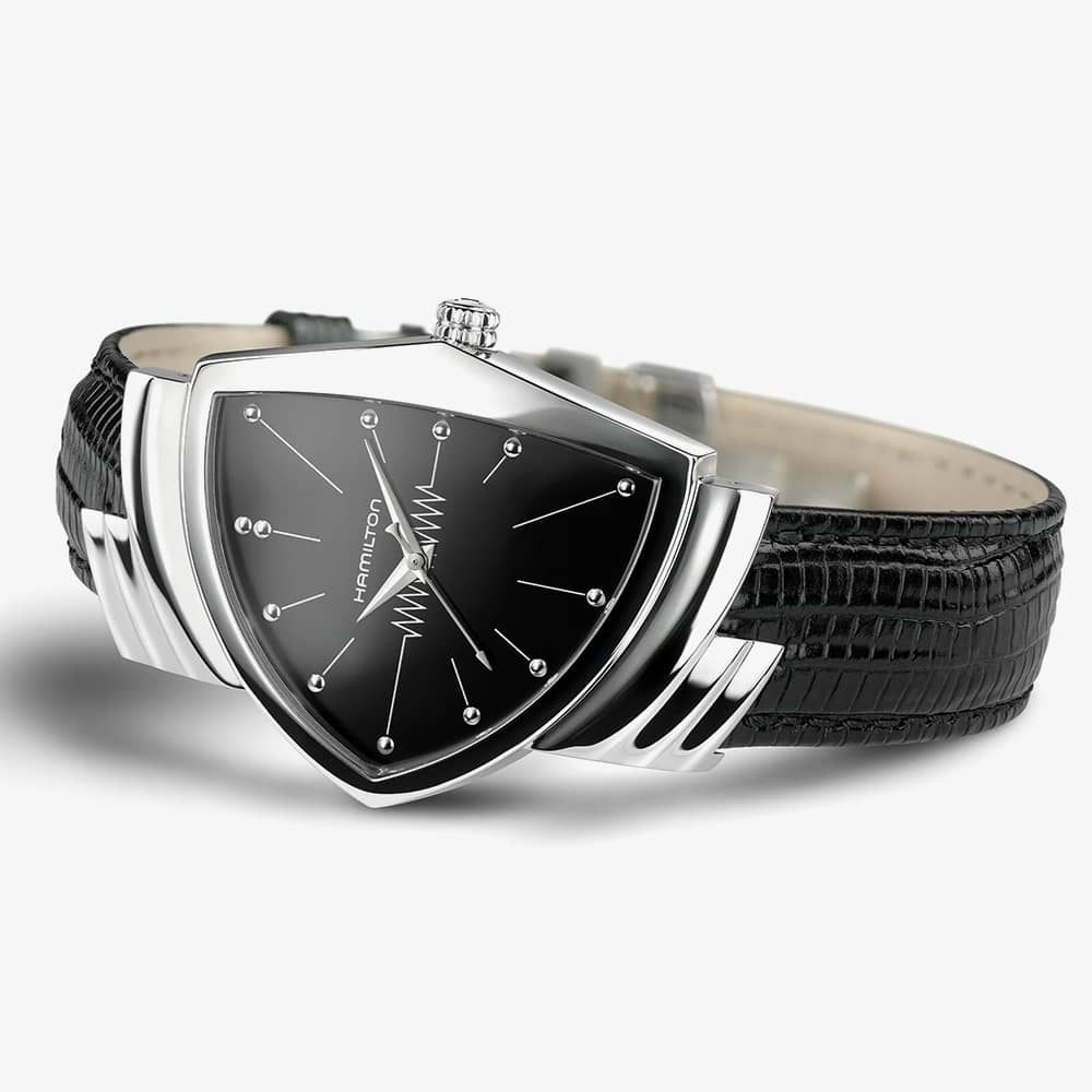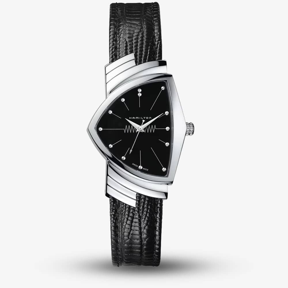 The original Ventura, introduced in 1957, made history as the world's first electric, battery-powered watch. With its bold and unique design, it swiftly became an icon and a sought-after collector's item. The latest incarnation of the Ventura faithfully honours the original, reflecting the pioneering shield-shaped celebration of Mid-Century Modern design.