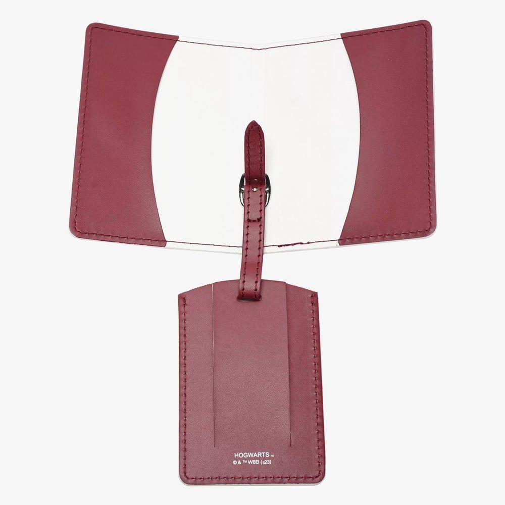 The Alumni Gryffindor Passport Holder and Luggage Tag set from Harry Potter by WARNER BROS is the perfect travel accessory for any fan of the wizarding world. This red and gold set brings Hogwarts magic to life, allowing fans to proudly display their Gryffindor house pride as they travel. Crafted from shiny PU leather for easy cleaning. Packaged in a lidded gift box.