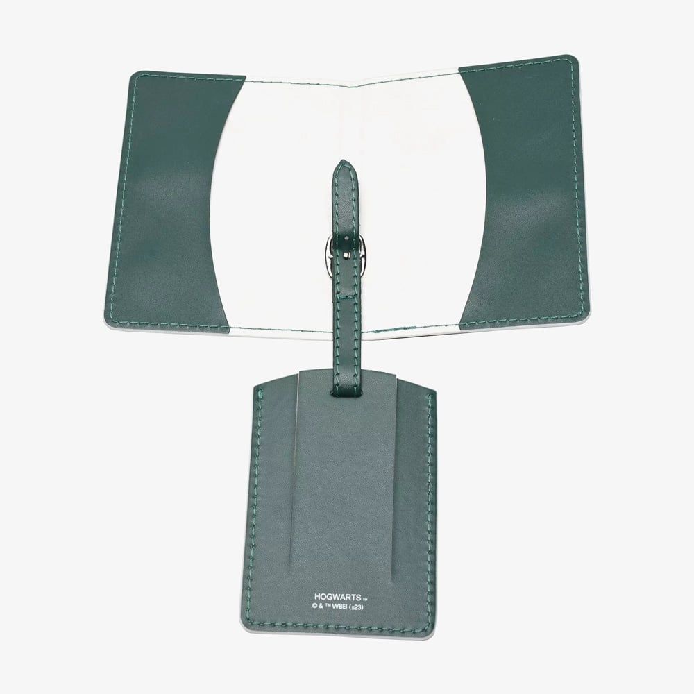 The Alumni Slytherin Passport Holder and Luggage Tag set from Harry Potter by WARNER BROS is the ultimate travel accessory for fans of the wizarding world and Slytherin house. This green and gold set captures the magic of Hogwarts, allowing fans to showcase their house pride while traveling. Made from shiny PU leather for easy cleaning. Packaged in a lidded gift box.