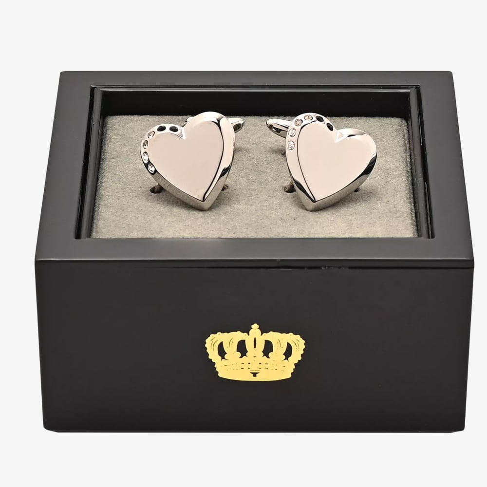 These cufflinks feature a delicate heart shape, adorned with sparkling crystal accents, adding a touch of romantic elegance to any formal attire.