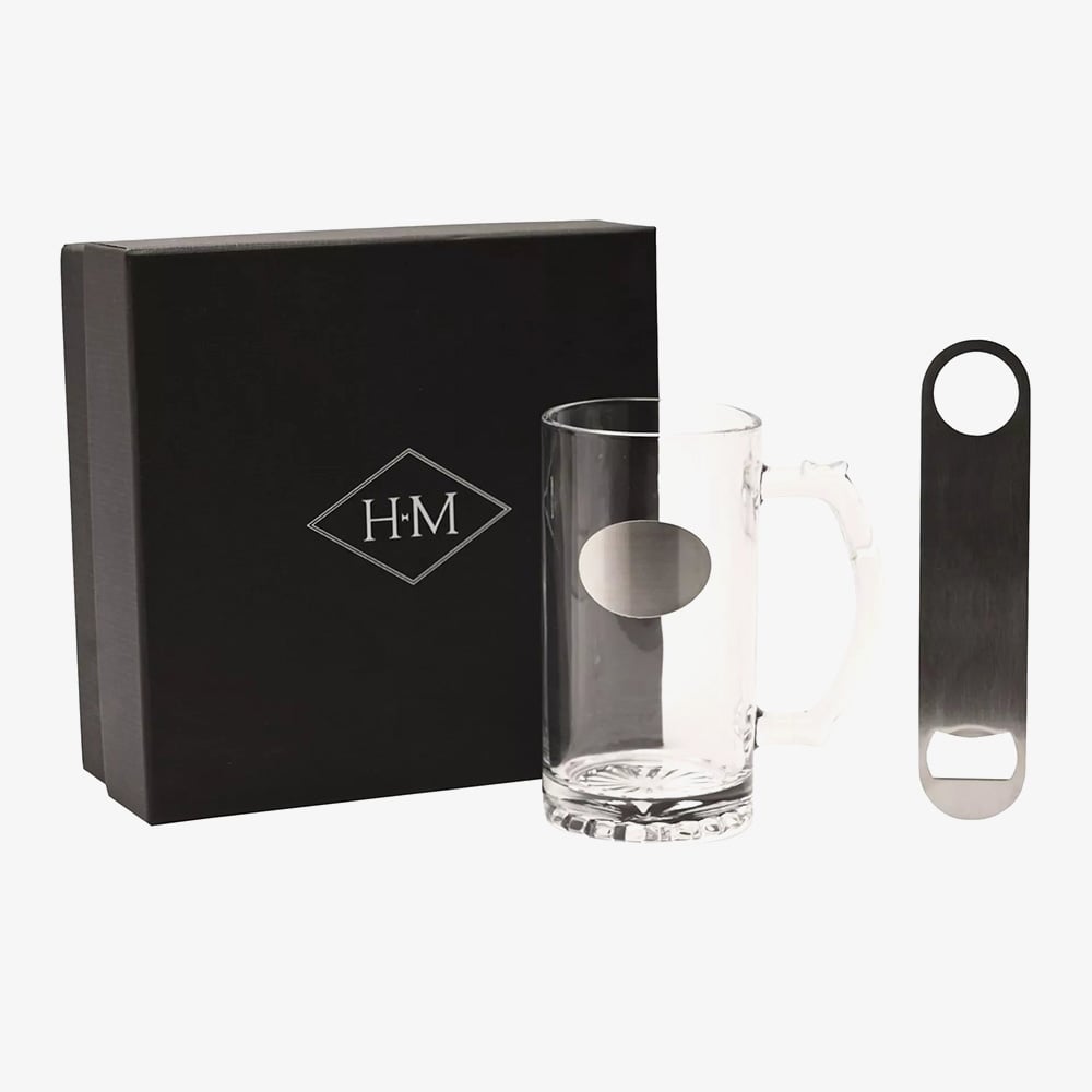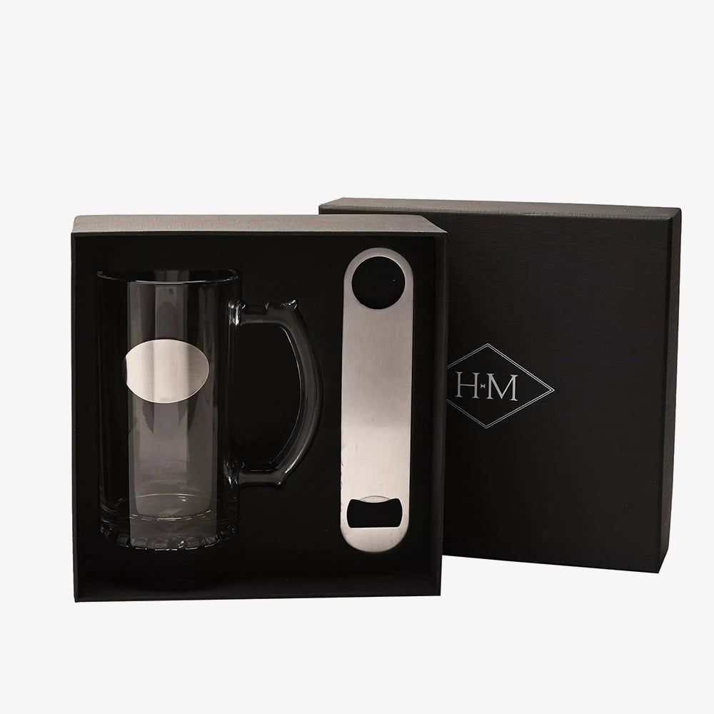 Revive the art of toasting with this HARVEY MAKIN® glass tankard and bottle opener set. Perfect for any beverage enthusiast, the tankard blends modern design with classic charm, while the metal bottle opener makes opening bottles quick and effortless. Presented in a black gift box, it’s ready to gift and impress. Ideal for birthdays, Father's Day, a gift for groomsmen, or just a great gift just because.