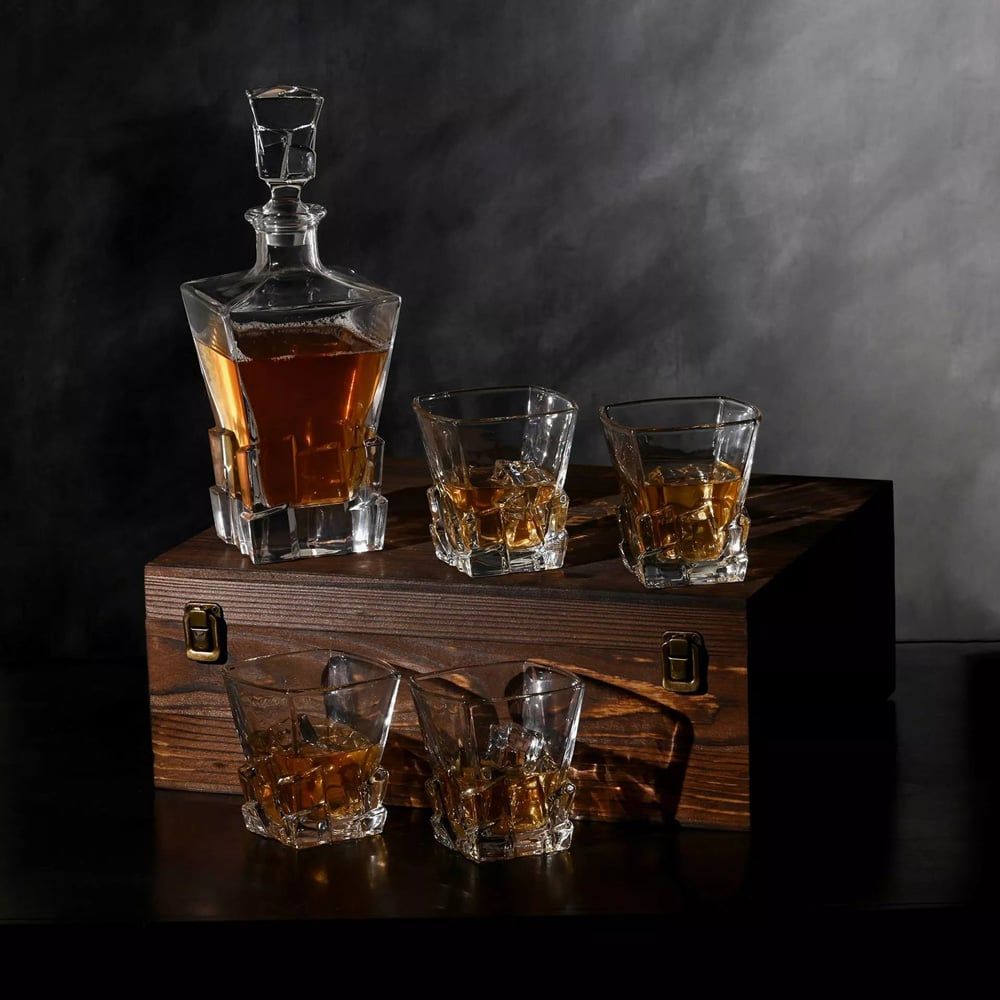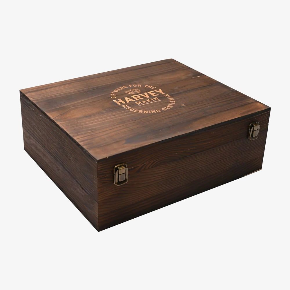 The Classic Collection 4 Whiskey Glasses and Decanter Set by HARVEY MAKIN is the perfect addition to any whiskey lover's collection. The beautifully crafted crystal decanter features an intricate design, making it a stunning centrepiece, while the four matching whiskey tumblers offer a complementary touch. Elegantly packaged in a wooden pine box, this set ensures a touch of luxury for those who appreciate a fine dram or two.