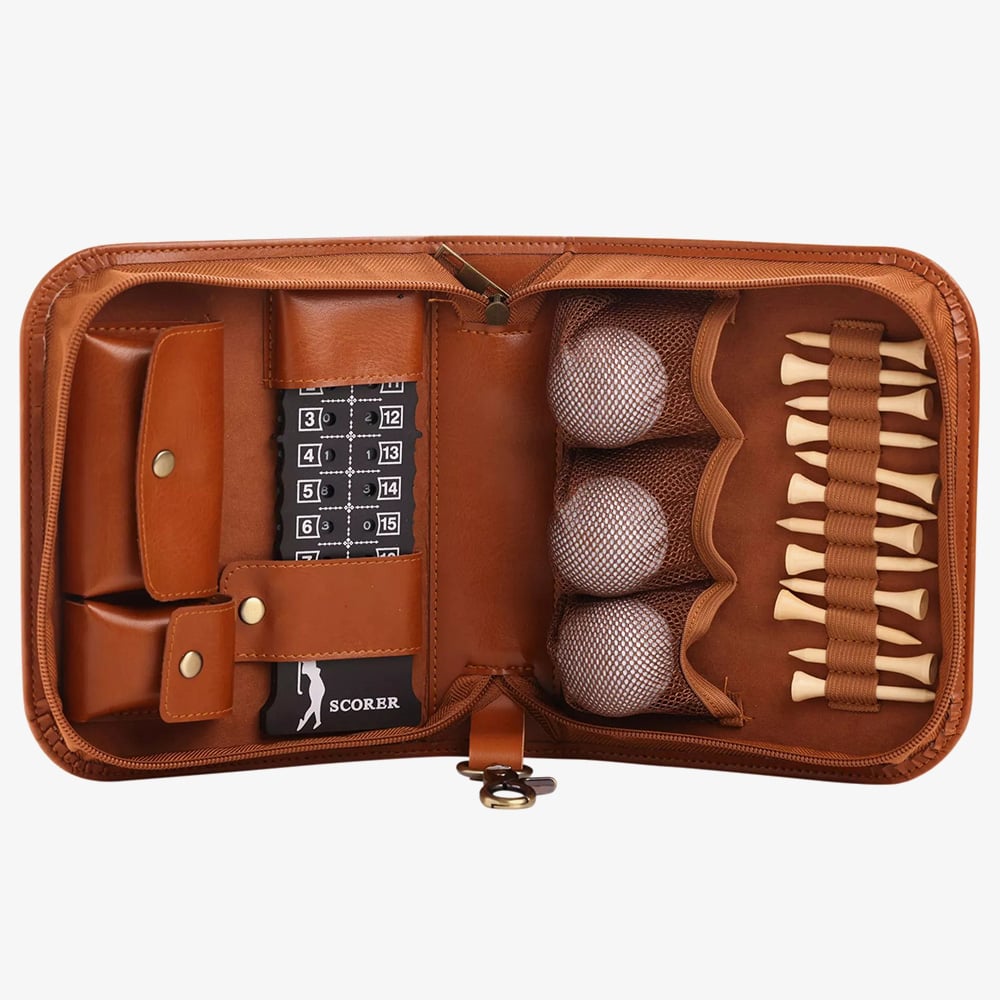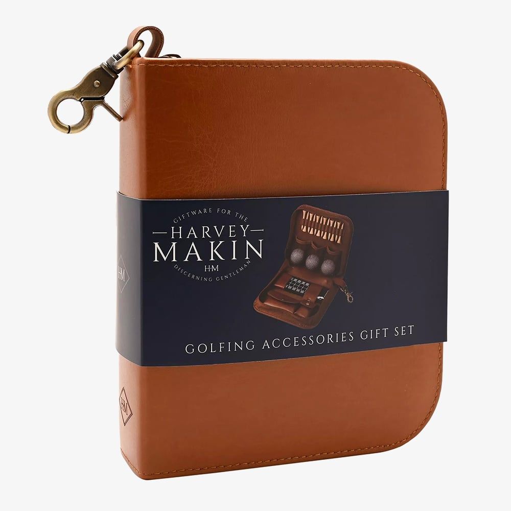 Presented in a stylish tan leather case, this Harvey Makin gift set is perfect for golf enthusiasts. It keeps golf balls and accessories neatly organised while adding a touch of sophistication to the game. The elegant case features multiple compartments for easy storage, combining practicality with refined style.