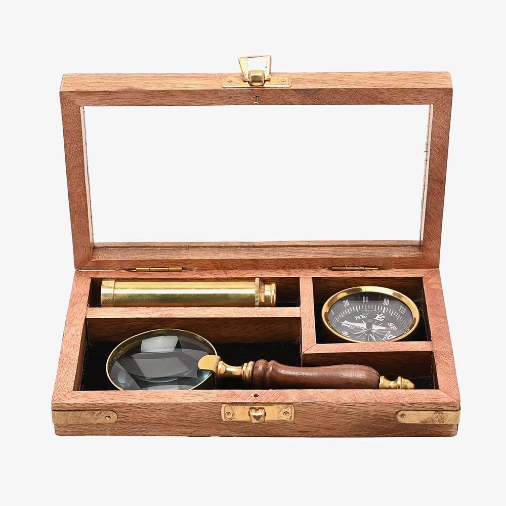Explore with style using this telescope, compass, and magnifying glass set from HARVEY MAKIN®. Designed for the curious and discerning gentleman, these miniature instruments come beautifully presented in a small wooden hinged case. Compact, lightweight, and effortlessly practical, this classic set combines timeless craftsmanship with refined sophistication.