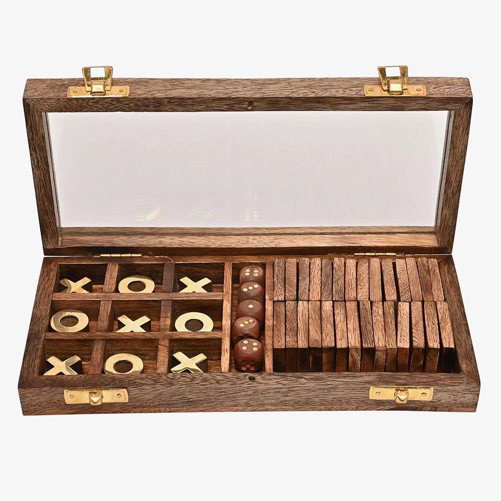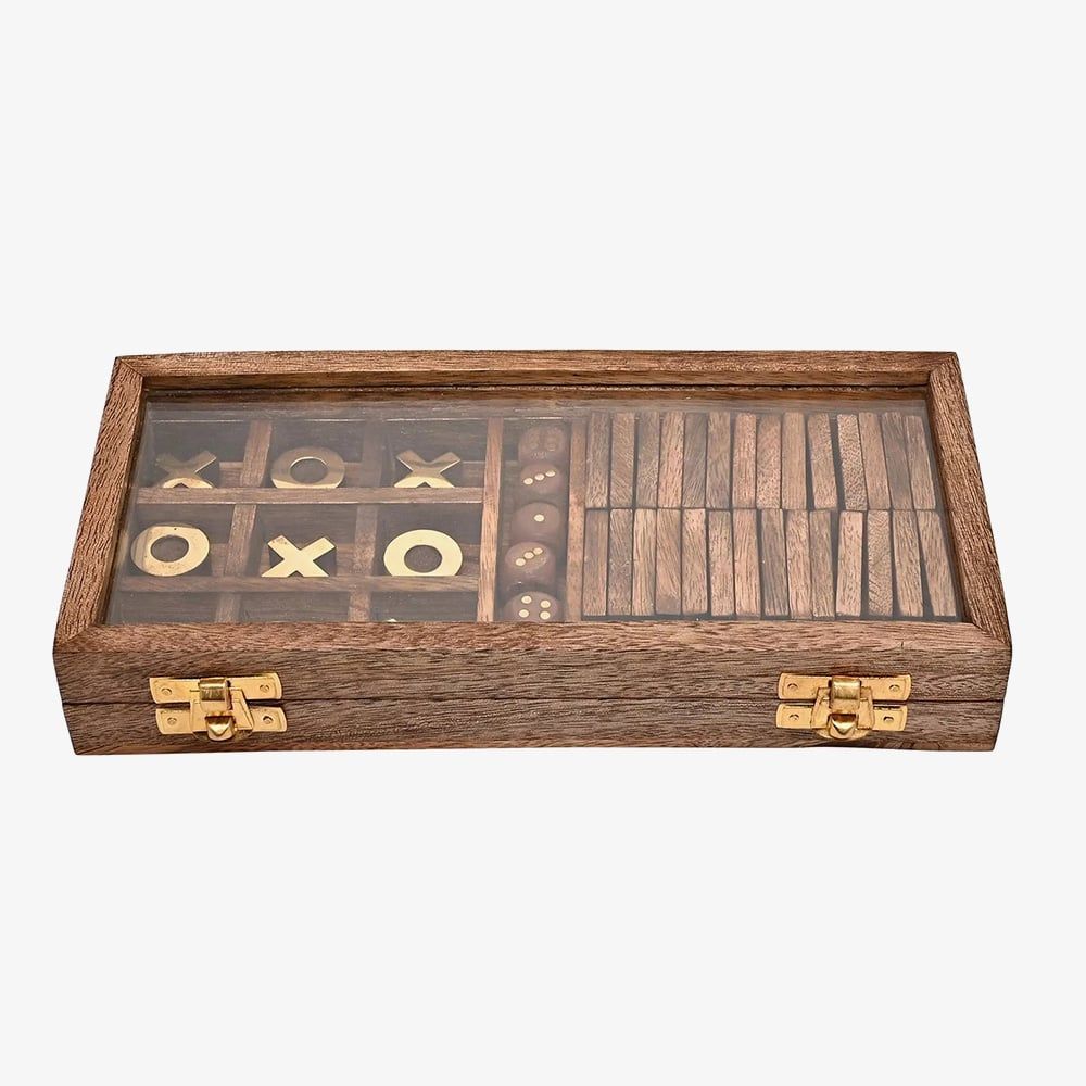 Combining quality and durability, the Harvey Makin Games Set is crafted from mango wood and includes Tic Tac Toe, Dominoes and Dice. A timeless gaming experience presented in a fine wooden case making a presentable gift to celebrate any special occasion.
