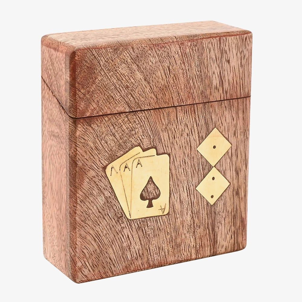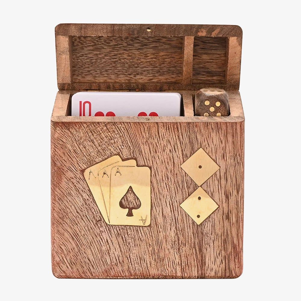 This classic collection blends traditional men’s giftware with a stylish, contemporary design. It includes a pack of playing cards and beautiful wooden dice housed in a hinged wooden box adorned with gold embellishments on the front. A sophisticated and thoughtful gift for any card enthusiast.