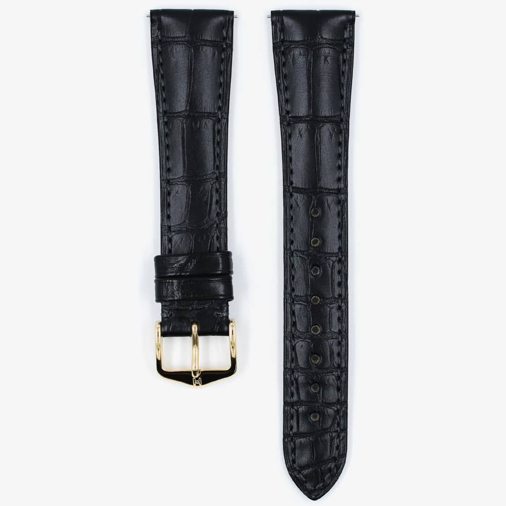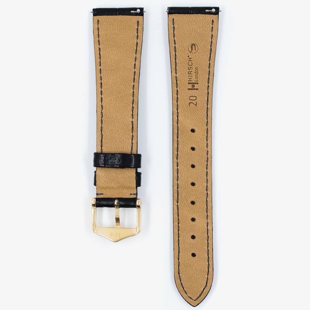 The HIRSCH 04207159-1-18 LONDON black leather strap has a gold tone traditional buckle and measures 110mm/70mm long (180mm overall). It is made from genuine Matte-finished alligator leather with a silkglove leather lining.