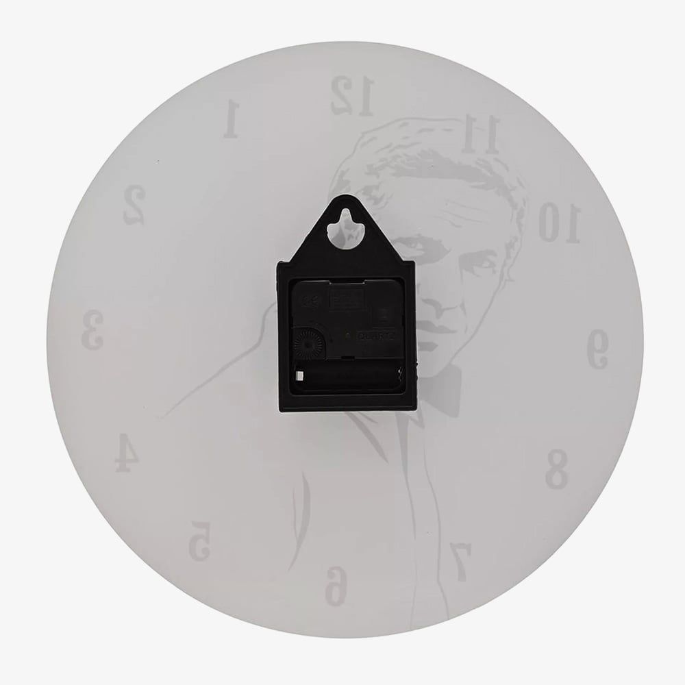 Decorate your home with this 60s Film Icon wall clock by Hometime. Celebrating the 60s film era, this glass wall clock powered by the Quartz movement for reliable timing has a monochrome design complete with slender silver tone hands. Battery operated, not included.