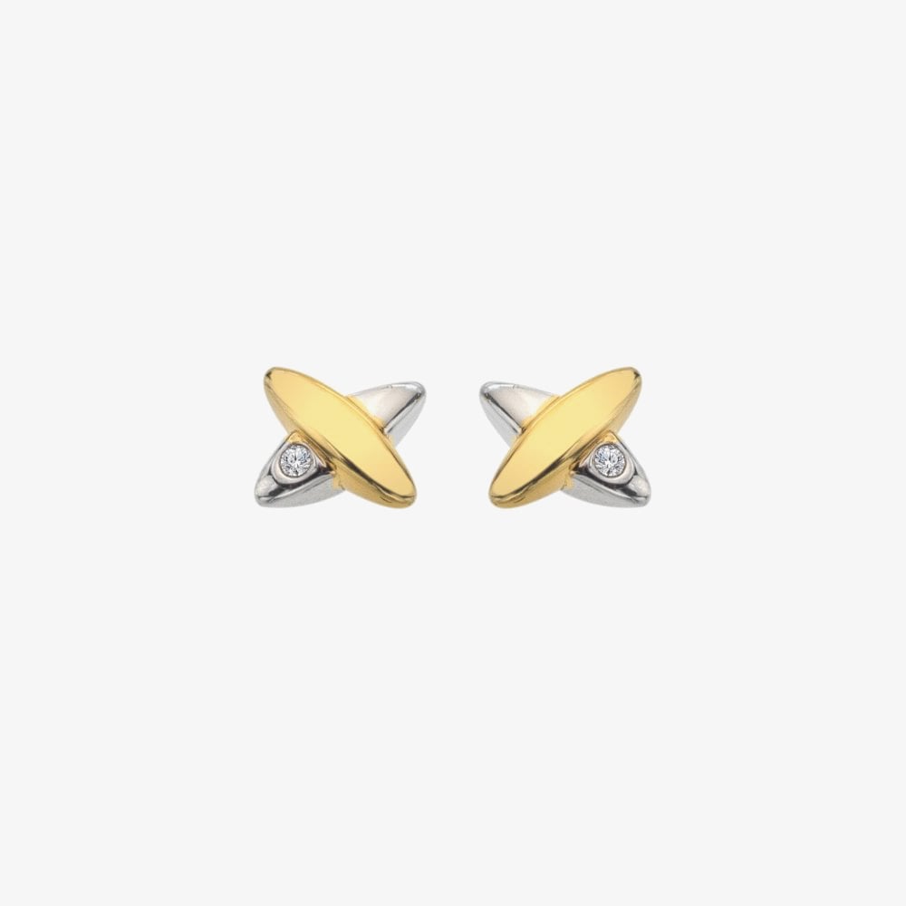 The Coupled stud earrings by Hot Diamonds feature a timeless crossover 'X' design, symbolising unity and connection. Crafted in sterling silver with luxurious 18ct yellow gold plating, each earring is hand-set with a single diamond, adding a touch of refined sparkle. A versatile two-tone look, perfect for elevating everyday style or complementing evening wear.
