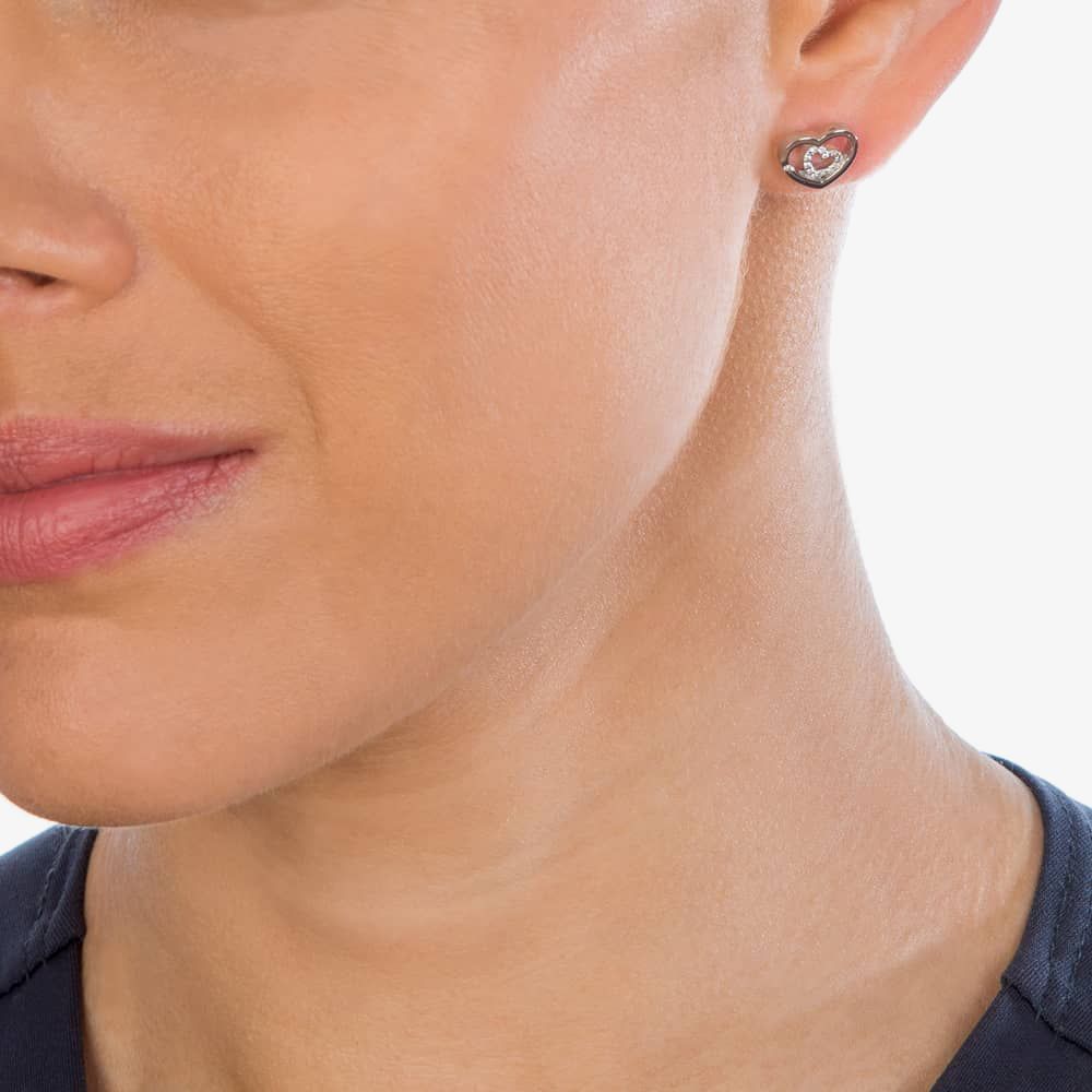 From our Most Loved Collection: Two hearts enchant one another with their individual beauty. These Enchanting earrings measure 10mm x 10mm and feature a real diamond in each. The inner heart is adorned with 24 beautiful white topaz stones adding that extra sparkle to your look.
