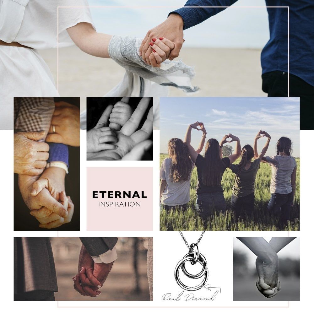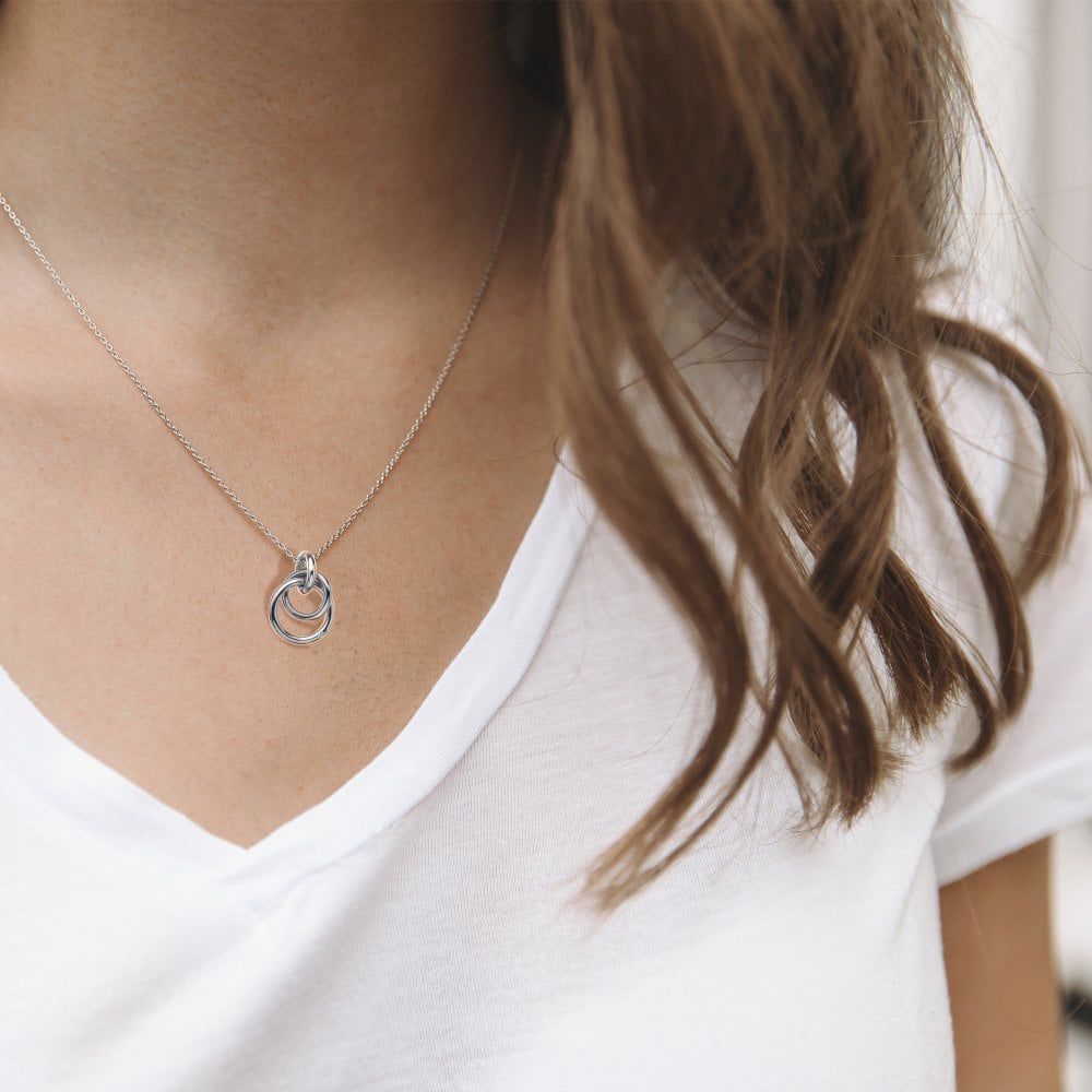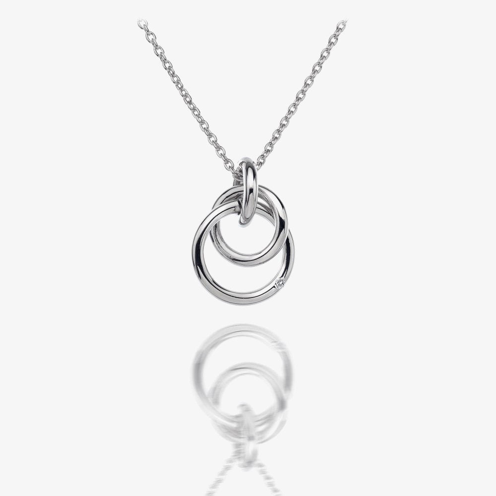 From our Eternal Collection: Connected by love…forever. This necklace features three interlocking rings crafted from 925 sterling silver with a one point real diamond. This pendant measures 21mm x 14mm and sits on a 40-45cm 925 sterling silver belcher chain.