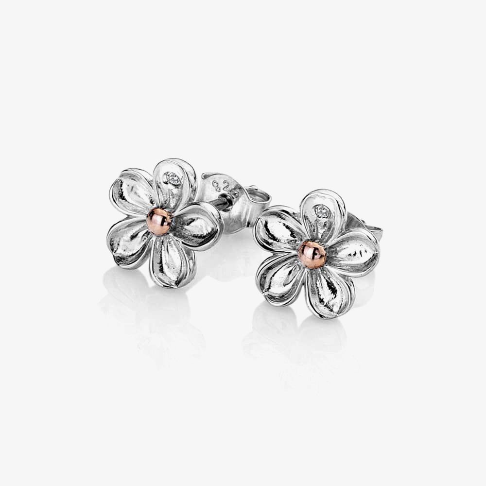 From our Forget Me Not Collection: The Forget Me Not is a floral celebration of true love and remembrance. These earrings measuring 12mm in length are delicately crafted in sterling silver highlighted with rose gold and adorned with two diamonds