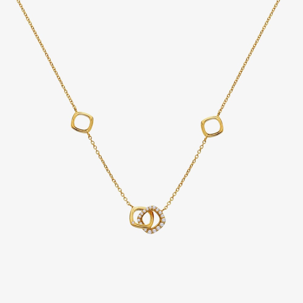 From the exclusive Hot Diamonds x GE collaboration, the Connected necklace blends modern design with symbolic elegance. Crafted in 18ct gold plated sterling silver, it features two interlinked soft square shapes, one beautifully set with sparkling White Topaz, the other adorned with a hand-set real diamond. A graceful expression of connection and contrast, this piece is perfect for both everyday wear and special occasions.