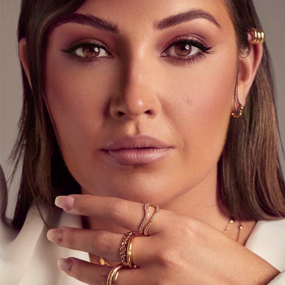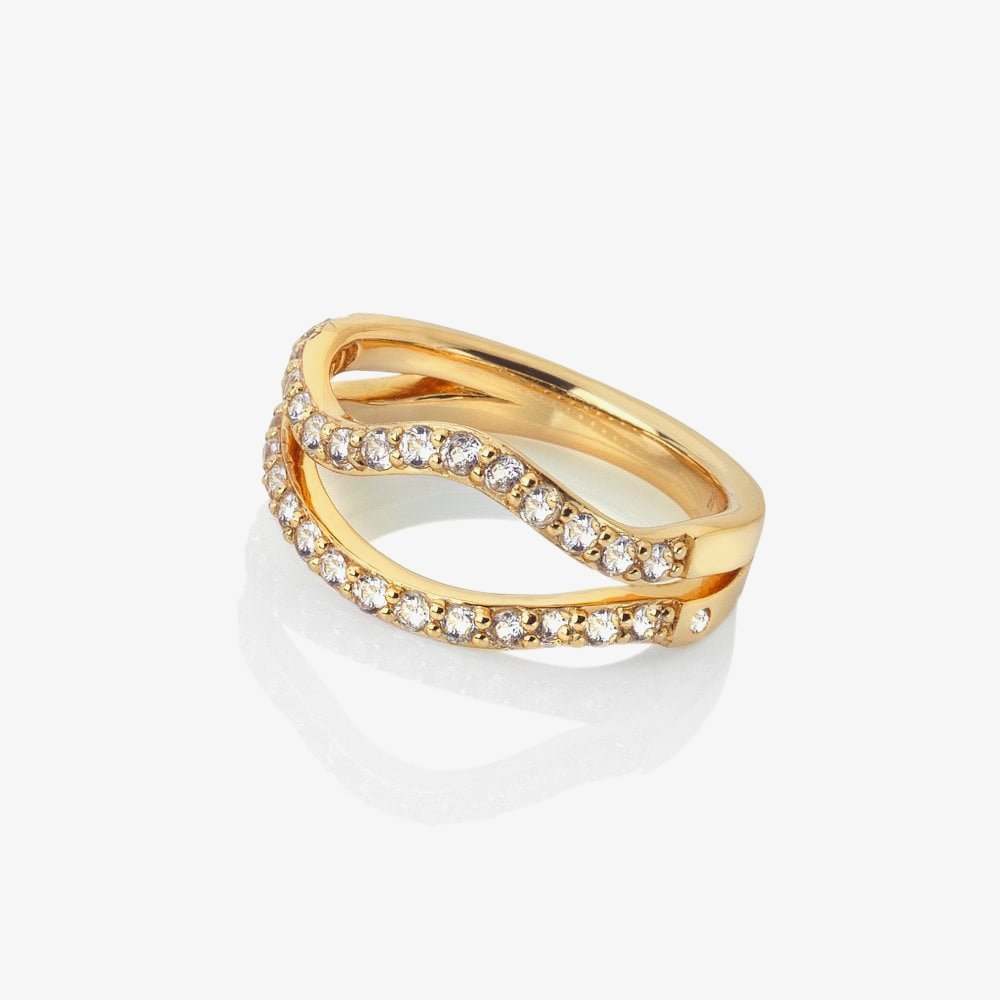 Hot Diamonds HD X Golden Edit Extravagance Large Double Ring DR223/LRG is crafted from 925 sterling silver with an 18ct gold plating. This delicate double ring features a two split curved design, each side adorned with sparkling white topaz set in four claws. This ring measures 10mm at its widest point and is a large in size.