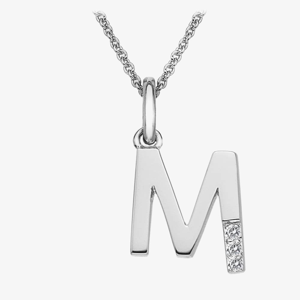 From our Love Letters Collection: Sterling silver letter 'M' Micro Pendant is adorned with three real 0.5 point diamonds. The letter sizing is 10mm x 7mm and a 40-45cm micro chain is included.