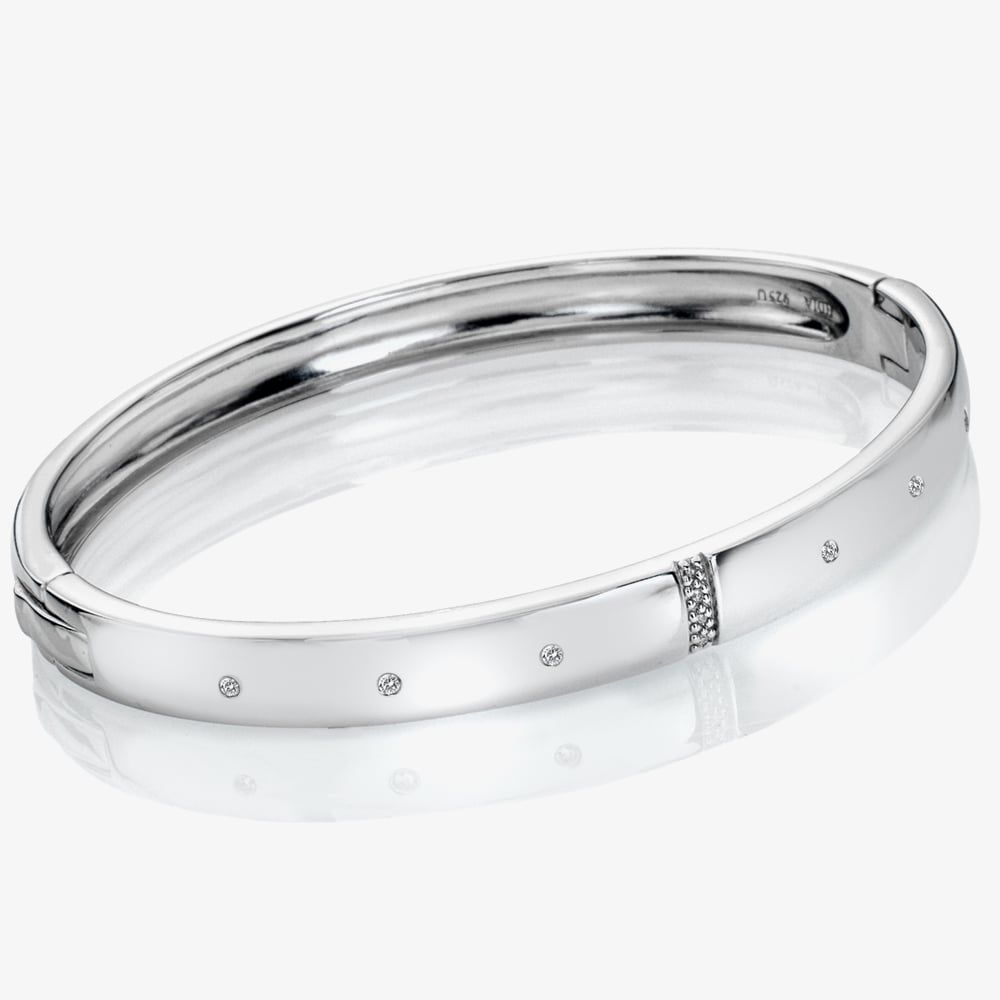 From the Most Loved Collection, this classic bangle has been crafted in rhodium plated sterling silver and is set with white topaz stones and a sparkling diamond. This bangle has a handy hinge mechanism making it very easy to take on and off.