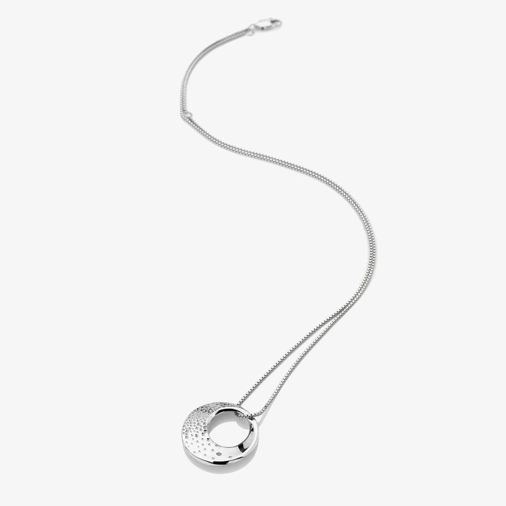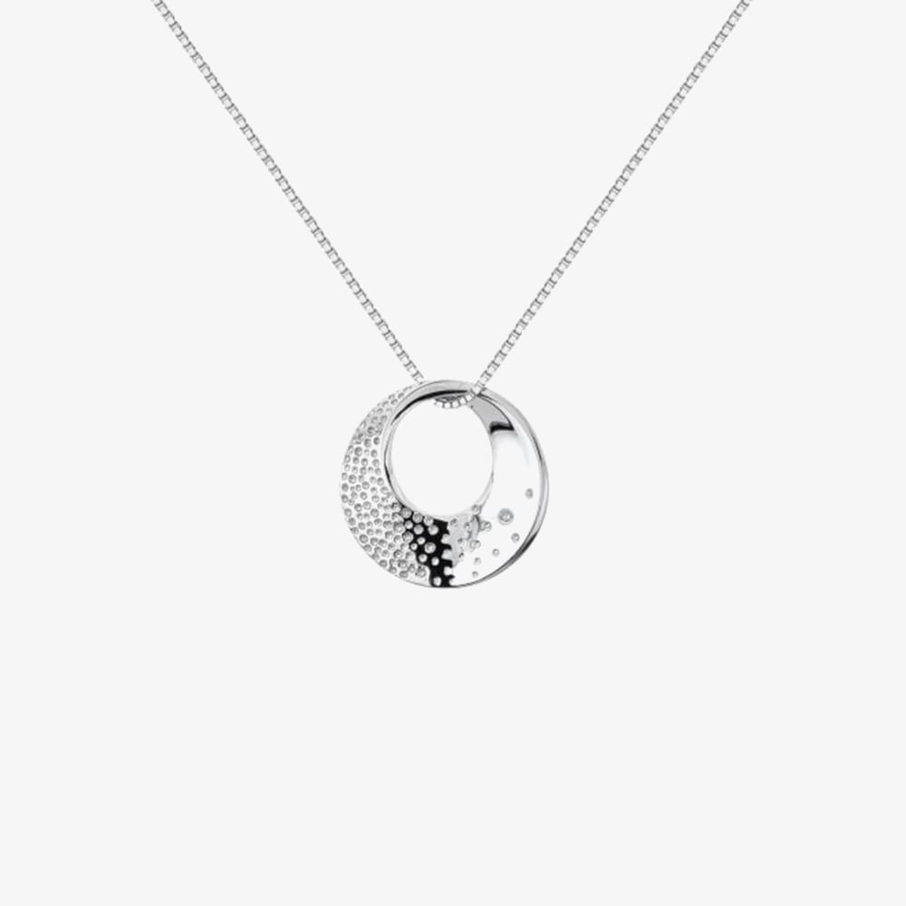 The Quest Circle Pendant draws inspiration from the waves and textures encountered on our journey through life. It symbolizes a long adventure filled with twists and turns, both rough and smooth. Crafted from 925 sterling silver, this pendant comes with a sterling silver chain and is embellished with a real diamond.