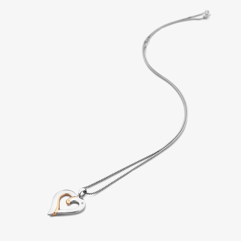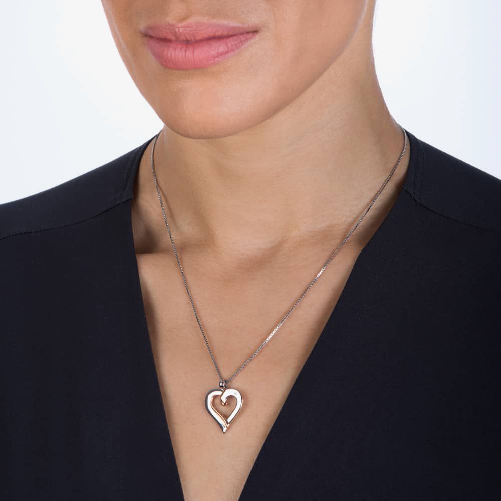 From our Most Loved Collection: Our new Together collection embodies the meaning of love cleverly combining the use of both sterling silver and rose gold. This Together pendant symbolises the coming together of two precious hearts lovingly adorned with a one point diamond and packaged with a 16-18" 925 sterling silver box chain.
