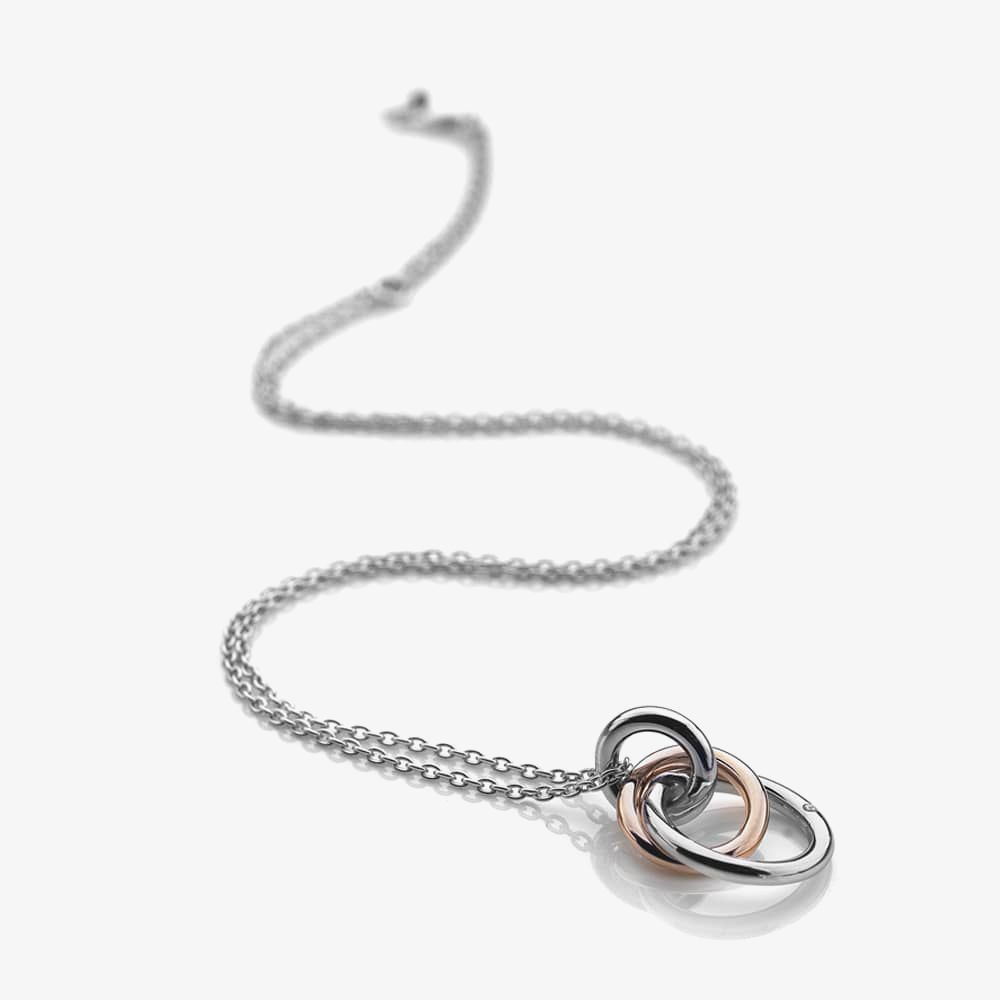 From our Eternal Collection: Connected by love forever. This necklace features three interlocking rings crafted from 925 sterling silver with a one point real diamond. This pendant measures 21mm x 14mm and sits on a 40-45cm 925 sterling silver trace train.