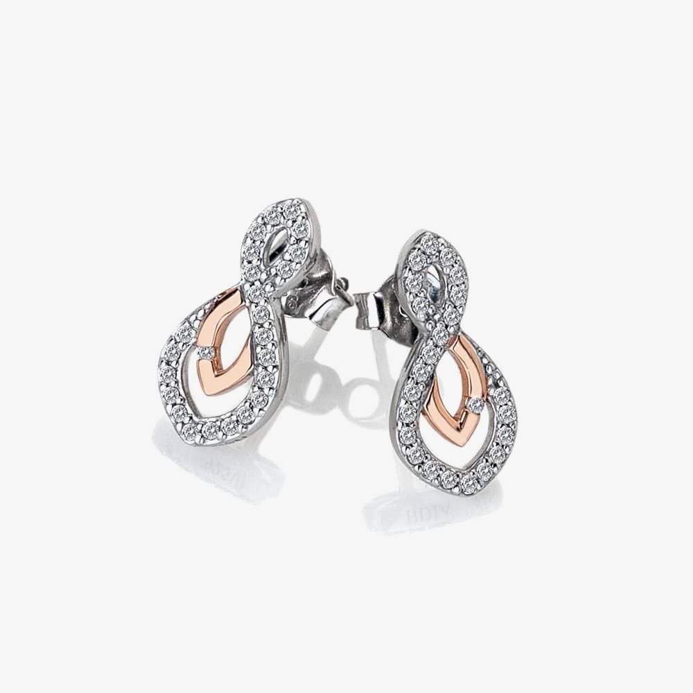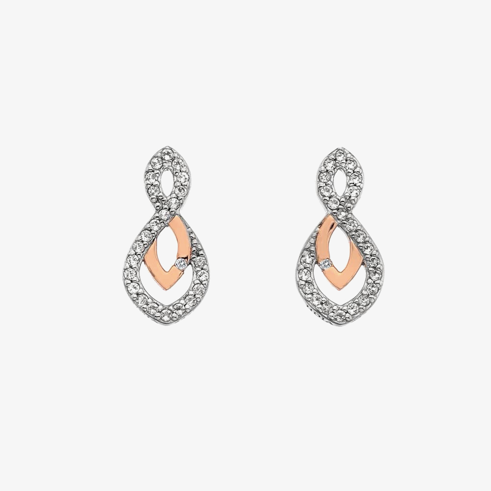 From our Harmony Collection: Peace and harmony within are symbolised with a stunningly organic shape in these 15mm x 7.5mm sterling silver and white topaz Harmony earrings with rose gold plated accents.