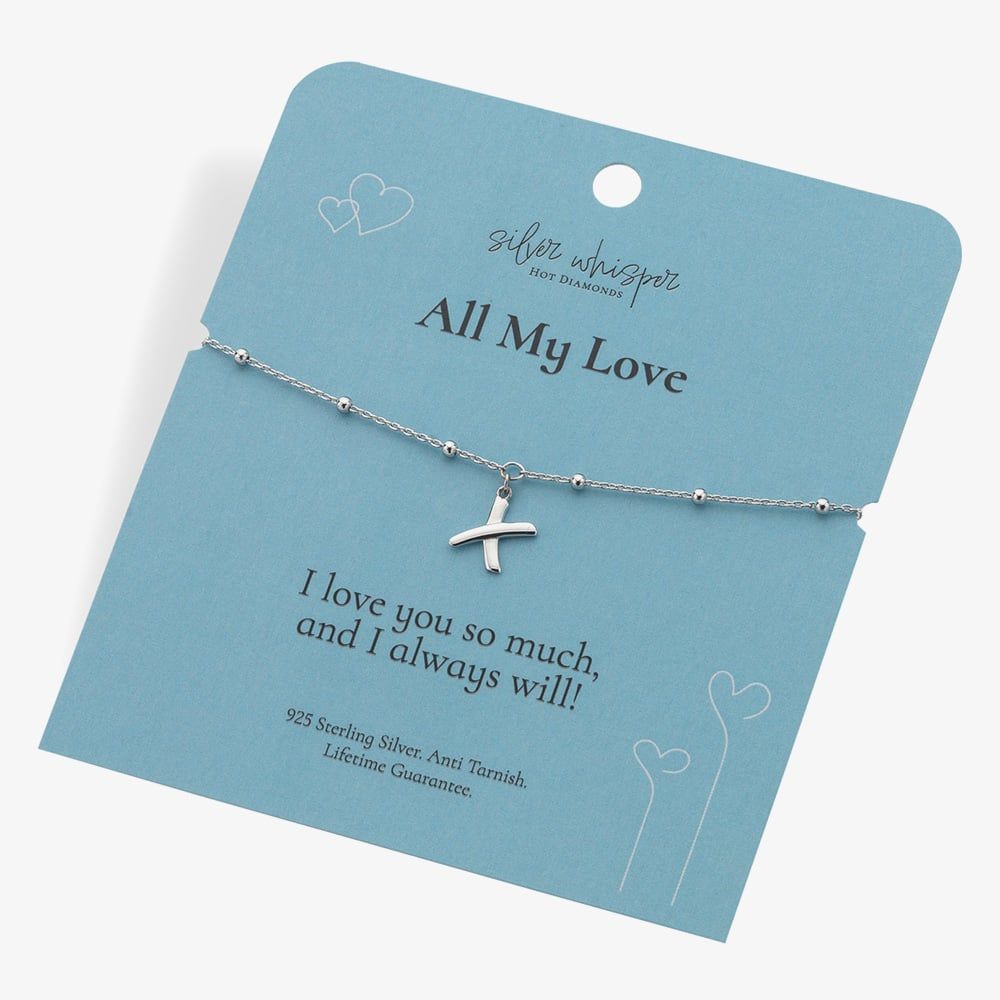 Express your affection with this elegant sterling silver bead and chain bracelet, featuring a simple yet meaningful “X” charm. A symbol of kisses and love, this bracelet is perfect for a special occasion or a way to brighten someone’s day with a thoughtful gesture. Presented on a card with an “all my love” message to show someone how much they mean to you.