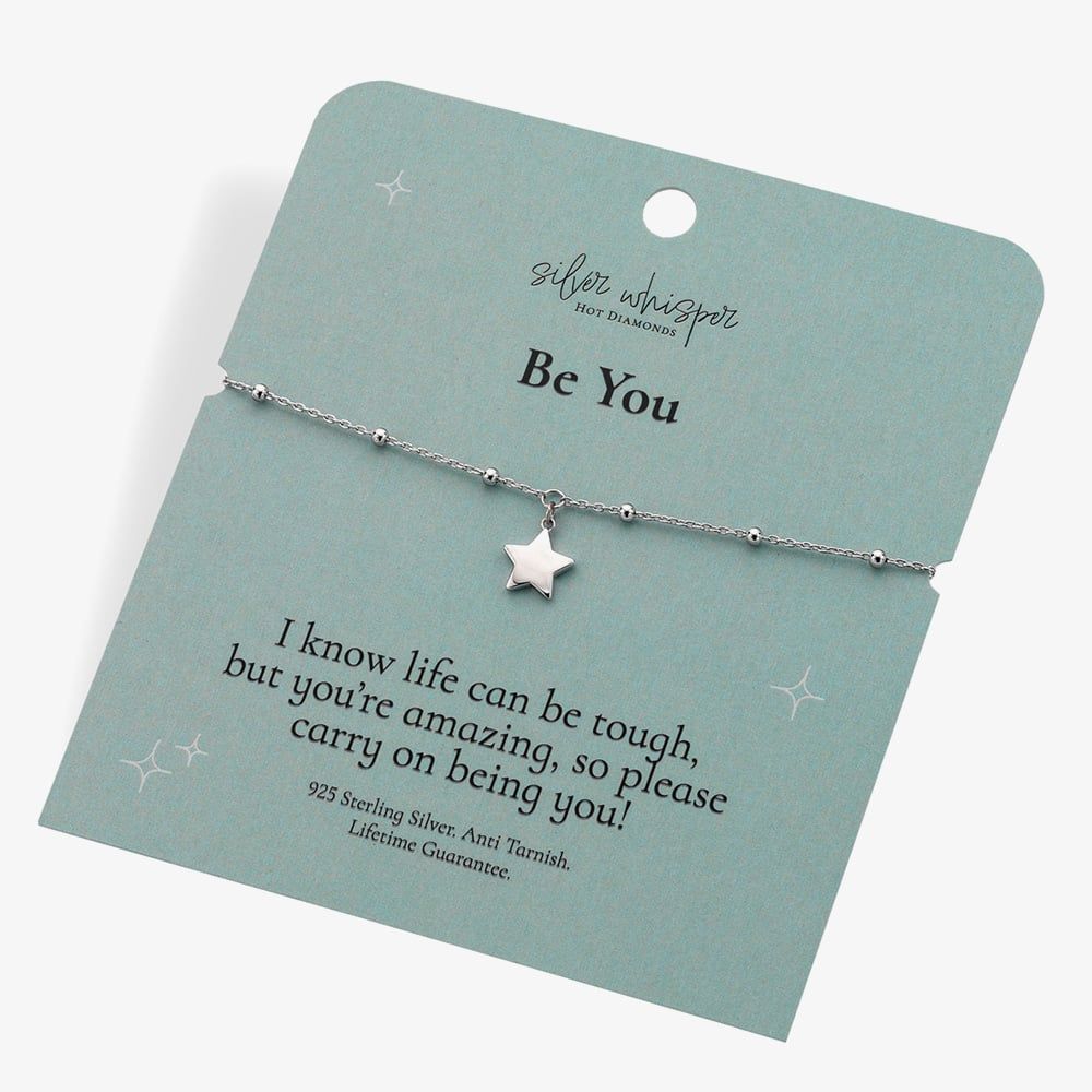 Shine in your own way with this sterling silver chain and ball bracelet, featuring a polished star charm as a symbol of individuality and confidence. Crafted from premium 925 sterling silver, its elegant design blends classic beads with delicate chain links. Presented on a beautifully designed card with an empowering “Be You” message, it’s a thoughtful gift or personal reminder to stay true to yourself.