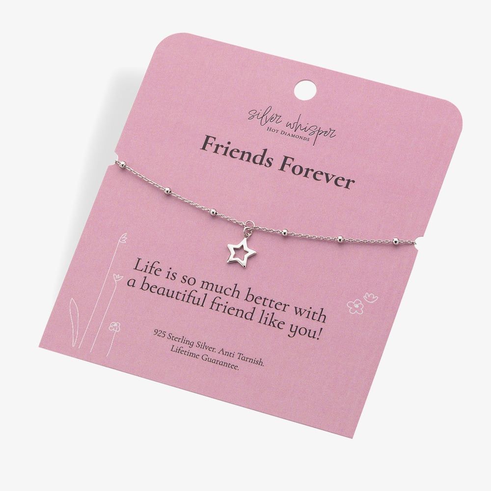 Celebrate a friendship that shines bright with this sterling silver bead and chain bracelet, featuring a delicate open star charm, a symbol of guidance, inspiration, and lasting connection. Beautifully presented on a card with a heartfelt Friends Forever message, it’s a meaningful gift to honour the bond that time and distance can’t dim.
