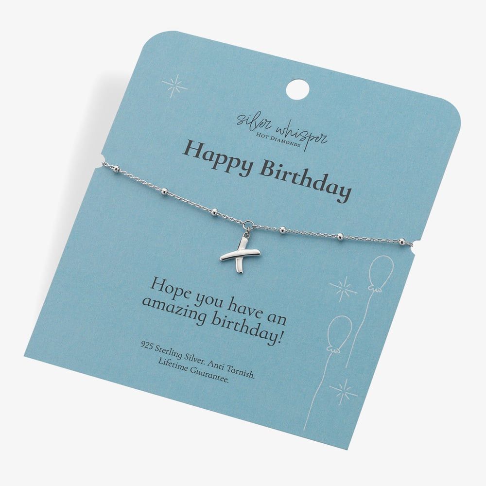 Celebrate in style with this elegant sterling silver chain and ball bracelet, featuring a sleek 'X' charm for a touch of modern flair. Crafted from high-quality 925 sterling silver, the bracelet combines delicate chain links with polished silver beads for a refined, versatile look. Presented on a beautifully designed blue card with a heartfelt "Happy Birthday" message, it makes the perfect gift to mark a special day with timeless elegance.