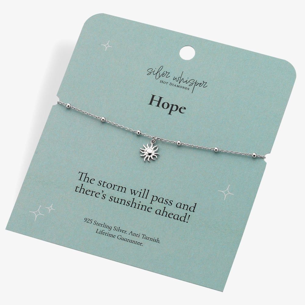 Radiating warmth and positivity, this sterling silver bead and chain bracelet features a beautifully detailed sun charm — a symbol of hope, new beginnings, and brighter days ahead. Thoughtfully presented on a card with an inspiring message about hope, this bracelet is a meaningful gift to uplift and encourage.