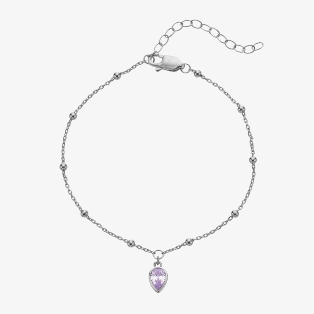Celebrate June birthdays with the elegant Hot Diamonds Silver Whisper June Birthstone Bracelet. Crafted from rhodium-plated sterling silver, this adjustable chain and bead style bracelet features a stunning pear-shaped charm in lavender purple cubic zirconia. Presented on a stylish gift card, it makes a beautiful and meaningful gift to add a personal touch to any outfit.