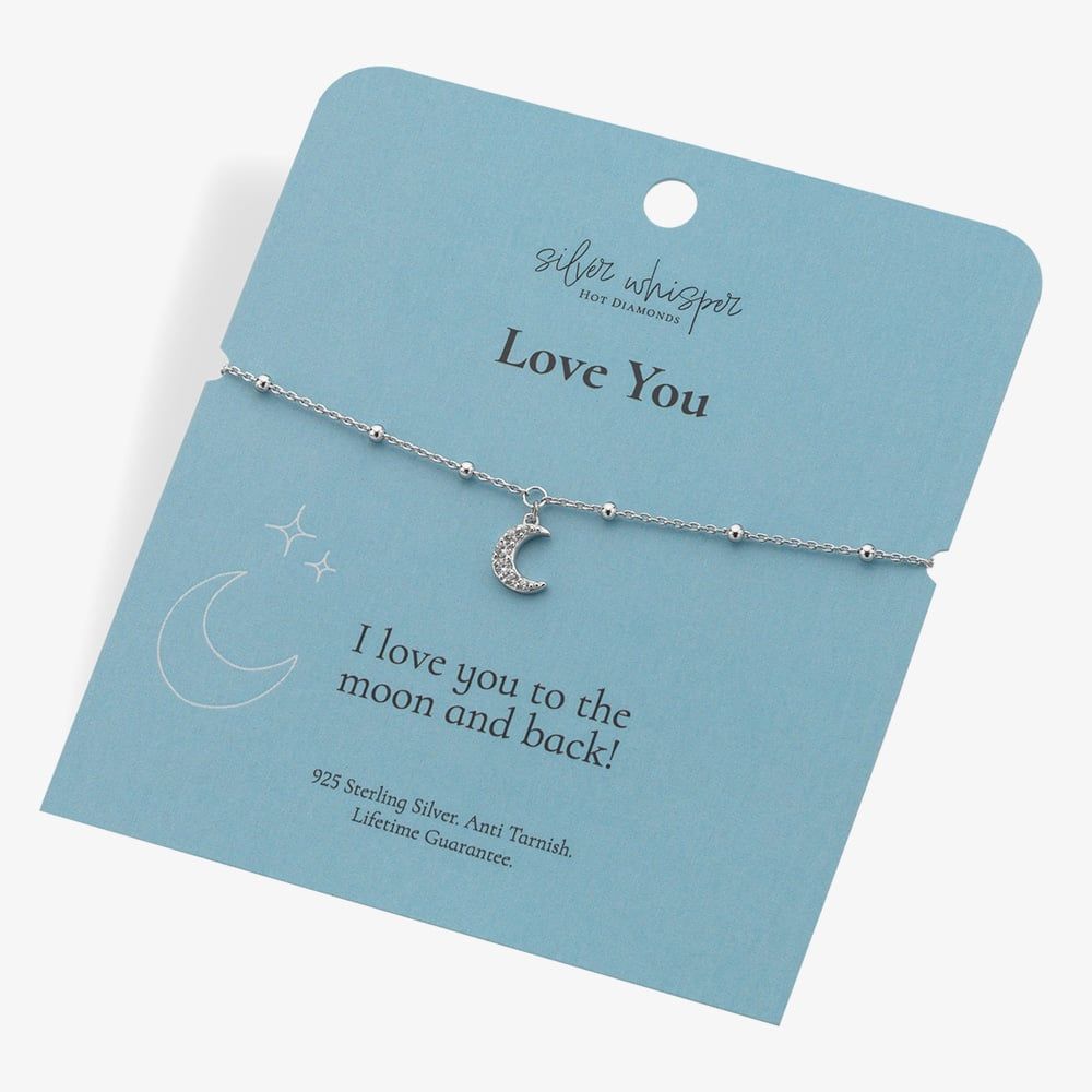 Shine a little light on someone special with this sterling silver bead and chain bracelet, featuring a beautifully crafted moon charm adorned with sparkling stones. A symbol of love, intuition, and connection, the moon adds a celestial touch to this delicate piece. Thoughtfully presented on a display card with a heartfelt love you message.