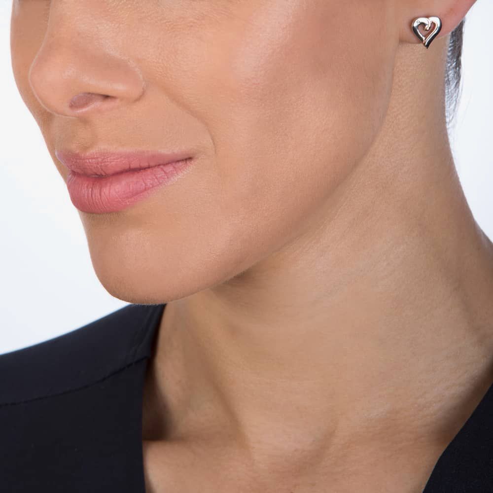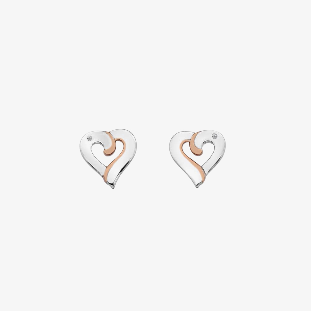 From our Most Loved Collection: Sumptuous rose gold melts over soft sterling silver hearts in the Sure collection. These stunning heart studs symbolise the coming together of two precious hearts and are complete with a 0.5 point diamond in each adding that extra sparkle to your look.