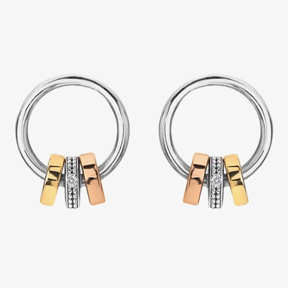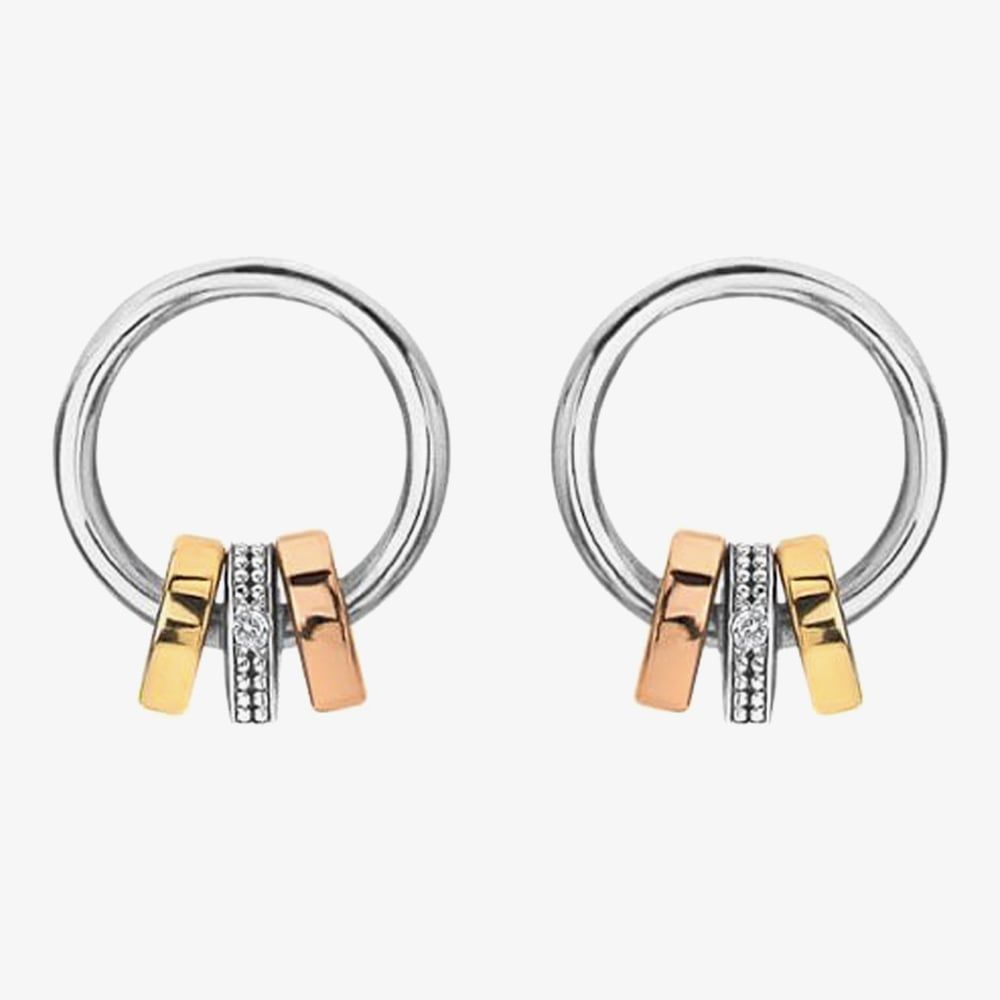 From Hot Diamonds Trio collection, these adorable sterling silver dropper earrings which feature an open circle design with a mini trio of mini barrels with rose & gold tone colouring & the centre one being set with a 1/2pt diamond in each earring. These earrings are completed with a post & butterfly back fastening. Dimensions: 11mm x 14mm.