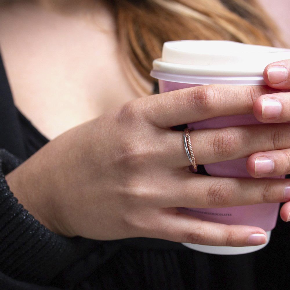 Showcasing beautiful design and class elegance, the Unity Rose Gold and Silver Double Band Ring (O) is the perfect way to add some unique style to any occasion. Made from high-quality 925 sterling silver and rose-gold plated sterling silver, this stunning double-band ring from the 'Unity' collection features a plain silver band fitted with a diamond interlinking with a rose gold plated sterling silver twisted rope band. As always with Hot Diamonds products - includes a small diamond on the ring. This ring is available in UK size O.