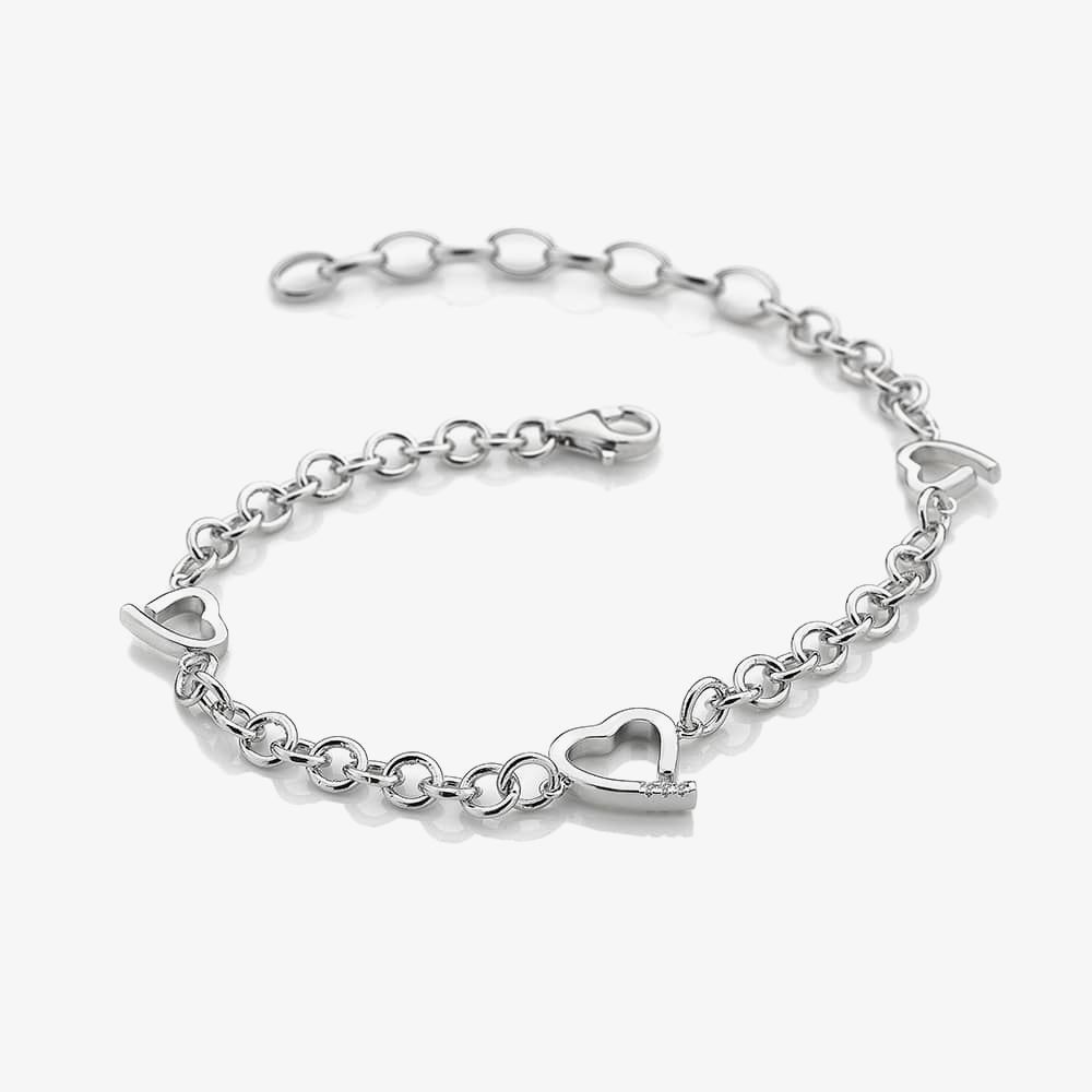 From our Most Loved Collection: Feel the warmth of your love when you wear this beautiful bracelet. Three modern sterling silver hearts adorn the open link bracelet. One heart is graced with 3 cubic zirconia stones and a diamond. This bracelet measures 18cm x 24cm.