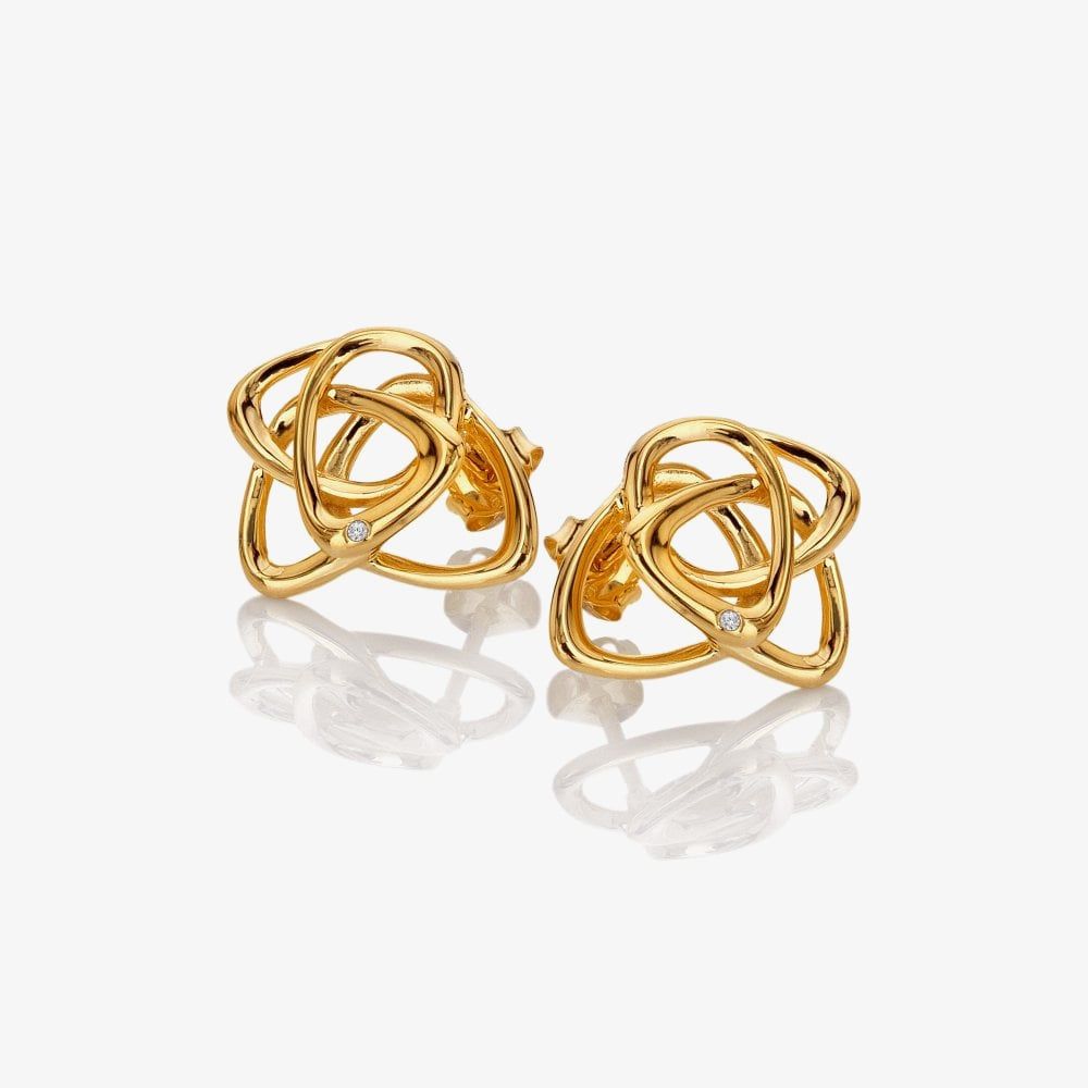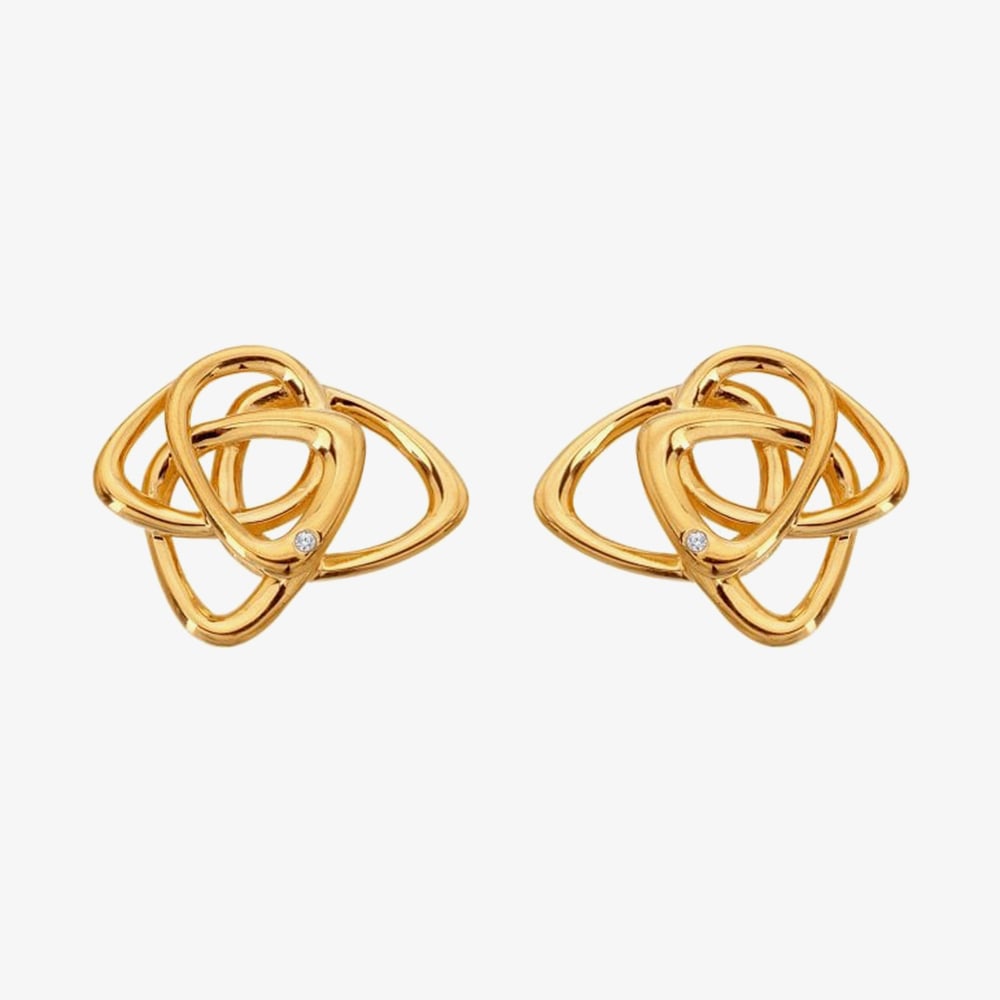The Hot Diamonds X Gold Edit Endless stud earrings features an elegant interlocked design, crafted from 18ct yellow gold-plated sterling silver. Adorned with a single diamond for a touch of timeless sparkle.