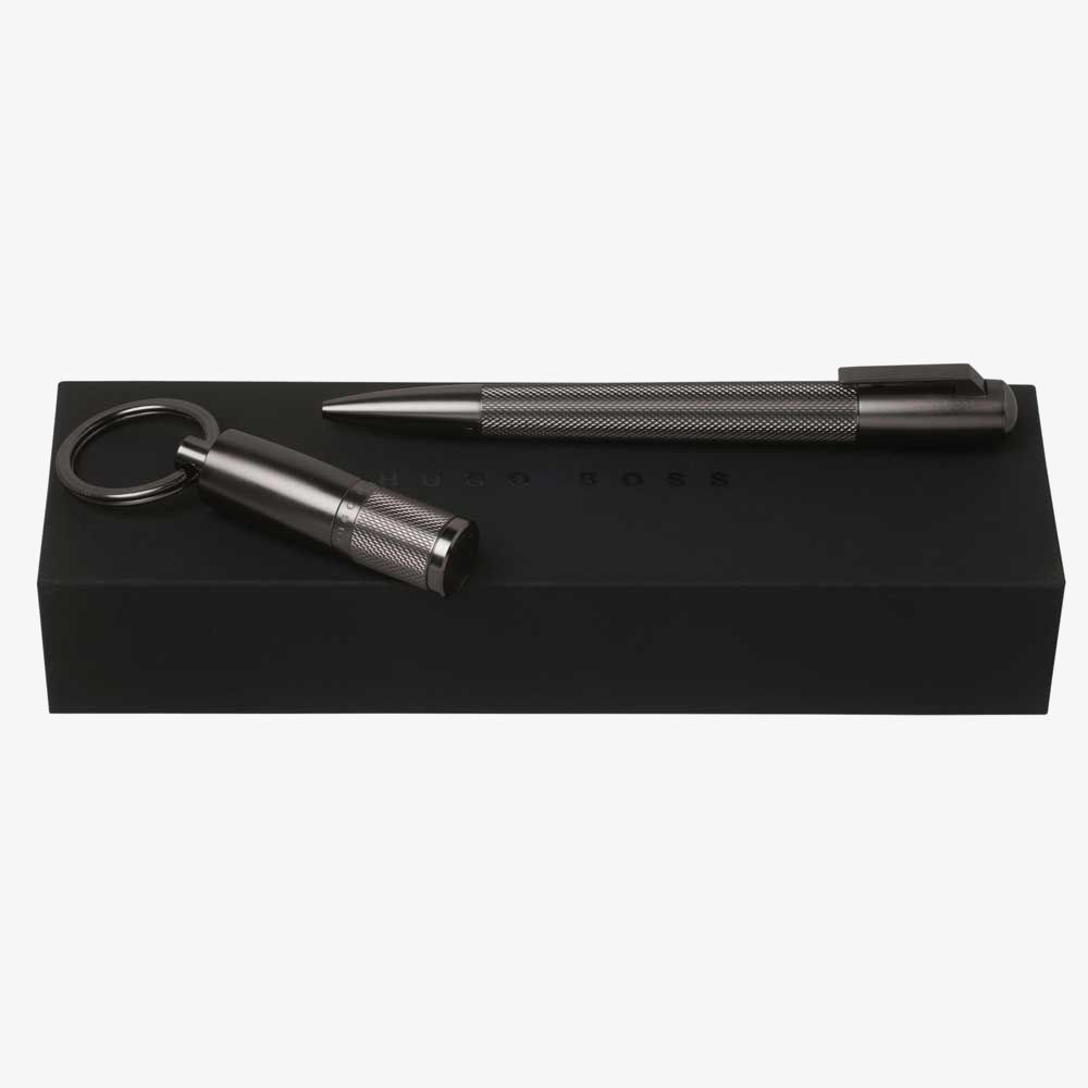 Give a wonderful gift this season with this stunning accessory set from the BOSS Pure collection. The matching USB keyring and ballpoint pen feature a textured pattern design, with an alluring dark chrome finish and the iconic BOSS logo, buy with confidence.