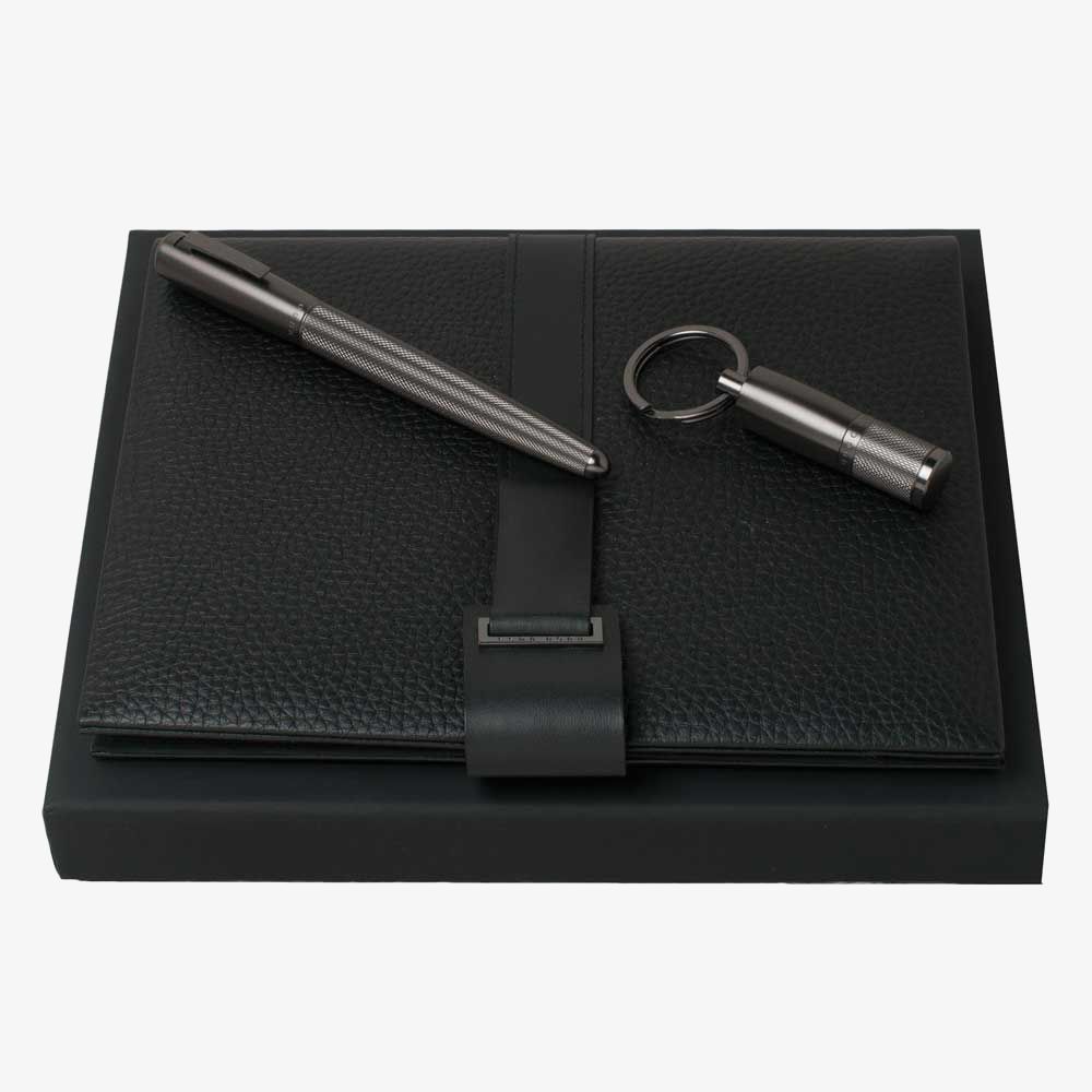 Be the envy of your office with this stunning accessory set from the BOSS Pure collection. The luxurious set includes a matching rollerball pen and USB keyring, with stylish textured detailing and dark chrome finish, accompanied by a leather bound organiser. All are adorned with the prestigious BOSS logo and radiate iconic style, buy with confidence.