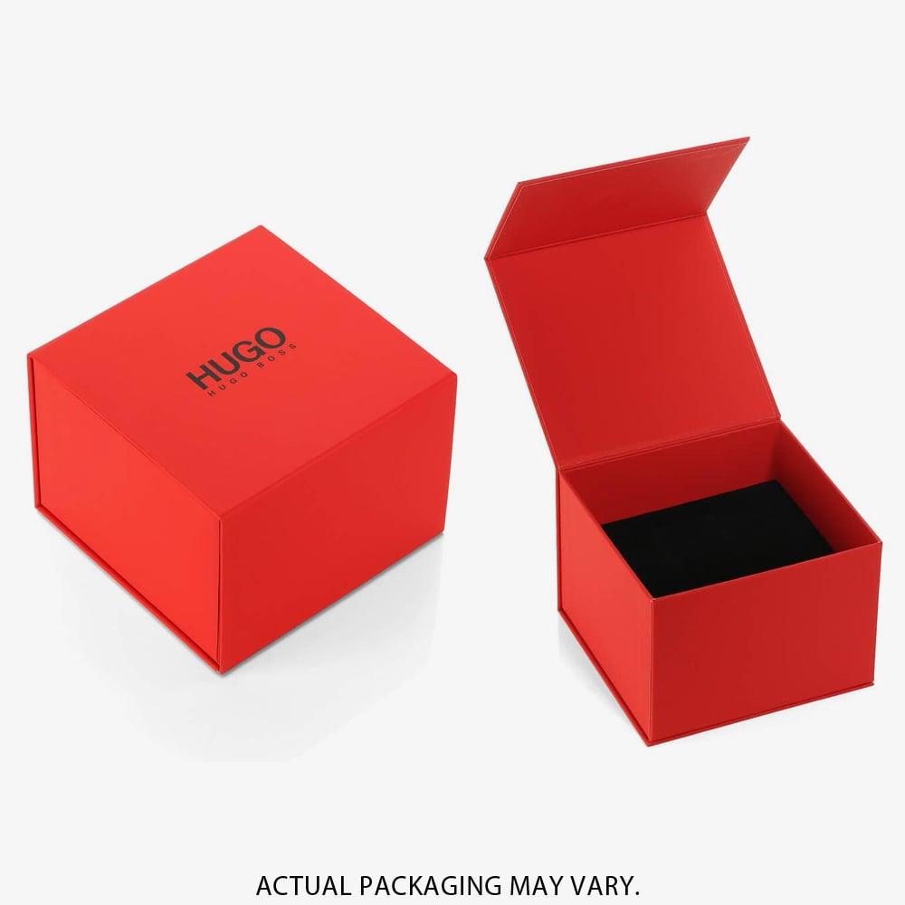 The HUGO 1540112 #Edgy watch combines a 38mm round-shaped stainless steel case and a two-toned stainless steel bracelet with a push-button deployment clasp. It has a silver sunray-brushed analogue dial with gold-plated day and date sub-dials, protected beneath hesalite crystal. Power is generated by the quartz movement. This model also has a water resistance of up to 30 metres.