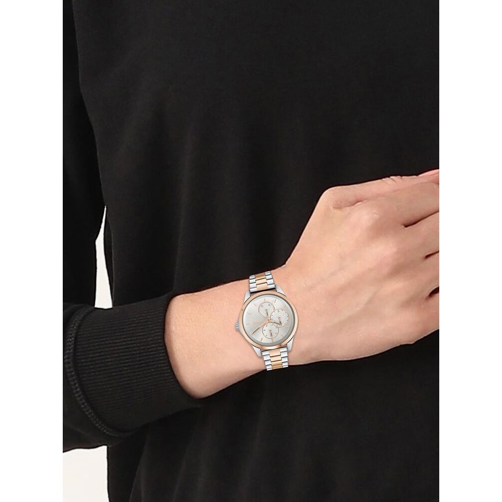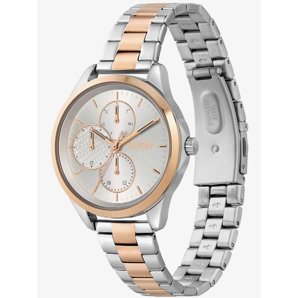 The HUGO 1540097 #FEARLESS MULTI watch combines a 36.80mm two tone stainless steel case and a two tone stainless steel bracelet with a push button deployment clasp. It has a silver tone/ white analogue dial with three subdials and rose gold tone accents, which is protected beneath mineral crystal glass. Power is generated by the quartz movement. This model also has a water resistance of up to 30 metres.