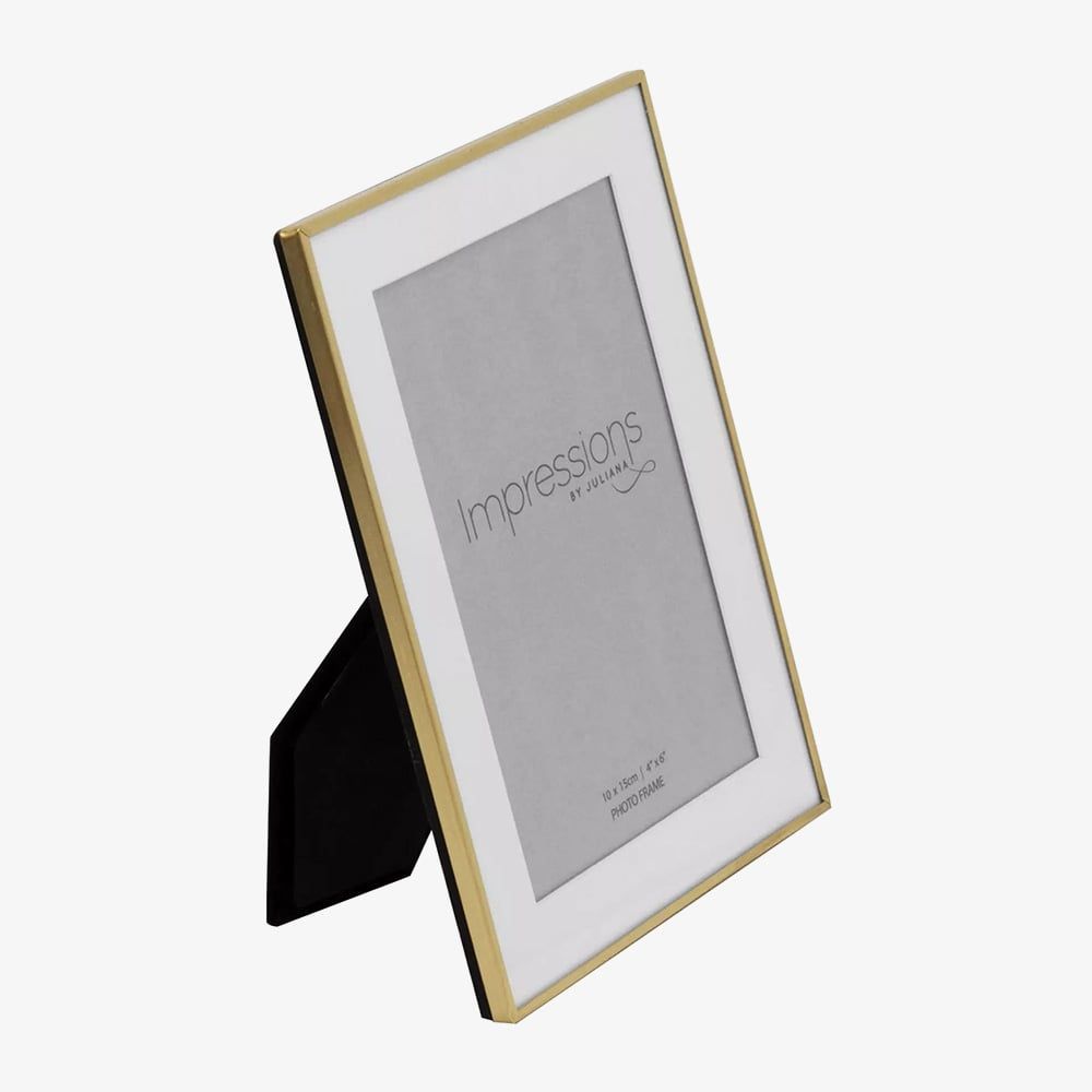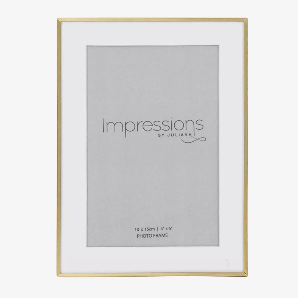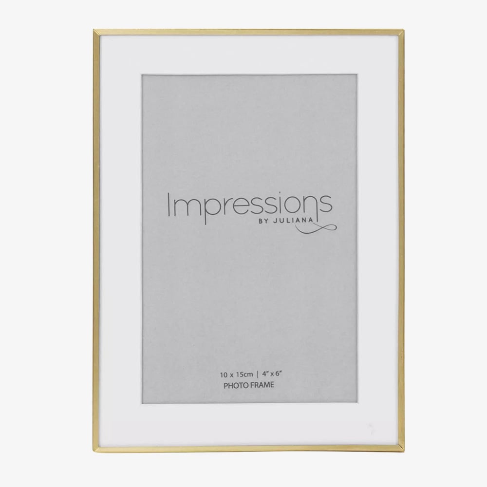Add a modern touch to your home with the Impressions brushed brass finish photo frame. It holds one 4x6 inch photo beautifully framed by a white mount. Designed for portrait or landscape display.