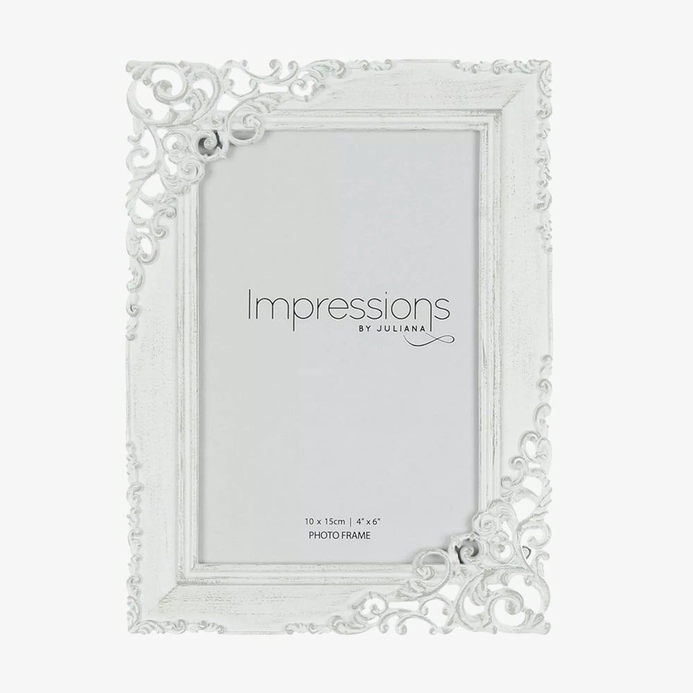The Impressions Cream Metal 4x6 Inch Photo Frame by Impressions by Juliana brings vintage charm to your home décor. Crafted from cream-coloured metal with ornate filigree detailing and a lightly distressed finish, it beautifully blends elegance with rustic character. Designed to hold one 4x6 inch photo in either landscape or portrait orientation, it’s completed with a luxury black velveteen strut for a refined display.