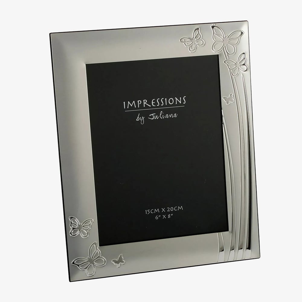 Add a touch of charm with this beautifully elegant silver plated photo frame, featuring a delicate butterfly design. Perfect for treasured photos, it includes a luxury black velveteen standing strut for a refined finish.